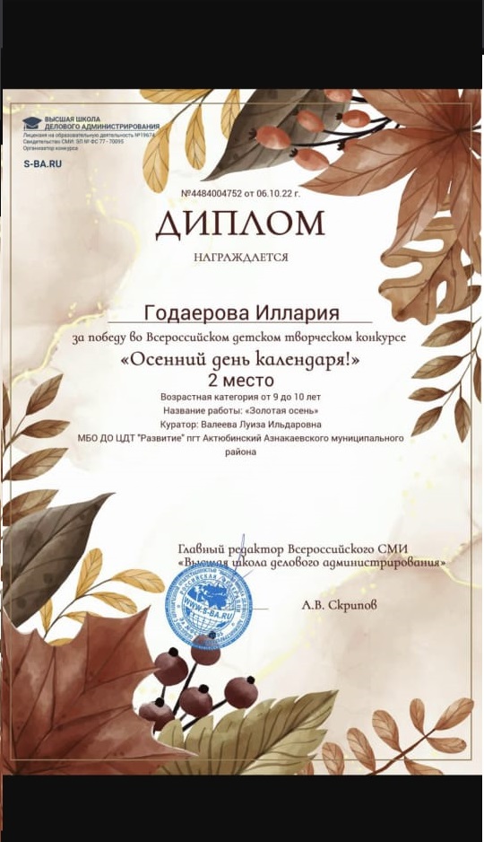 Диплом за 2 место в конкурсе "Осенний день календаря!", участница Годаерова И., педагог Валеева Л.И.