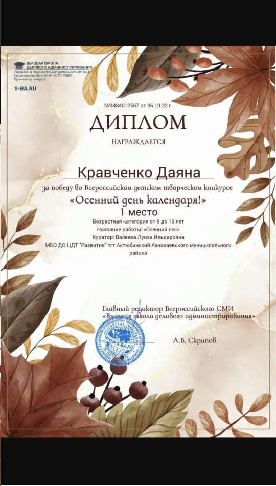 Диплом за 1 место в конкурсе "Осенний день календаря!", участница Кравченко Д., педагог Валеева Л.И.