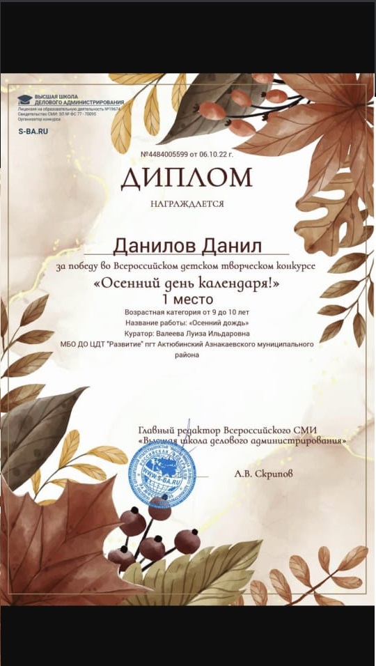 Диплом за 1 место в конкурсе "Осенний день календаря!", участник Данилов Д., педагог Валеева Л.И.