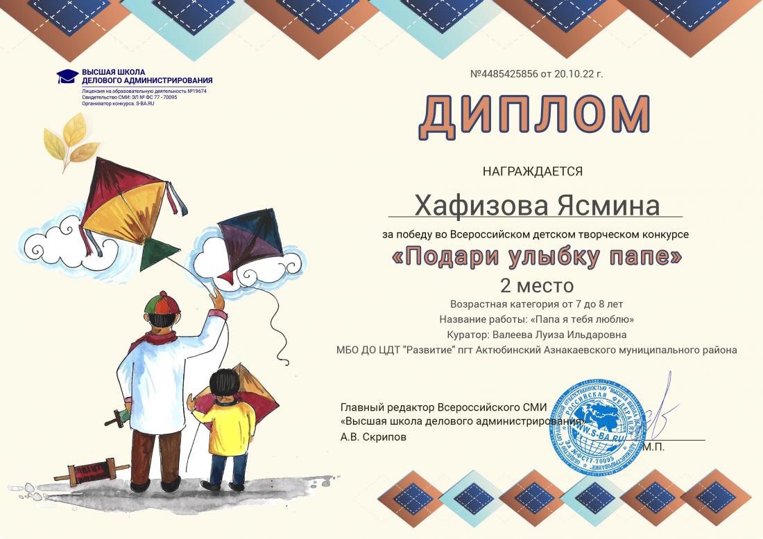 Диплом за 2 место в конкурсе "Подари улыбку папе", участница Хафизова Я., педагог Валеева Л.И.