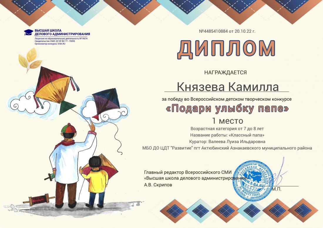 Диплом за 1 место в конкурсе "Подари улыбку папе", участница Князева К., педагог Валеева Л.И.