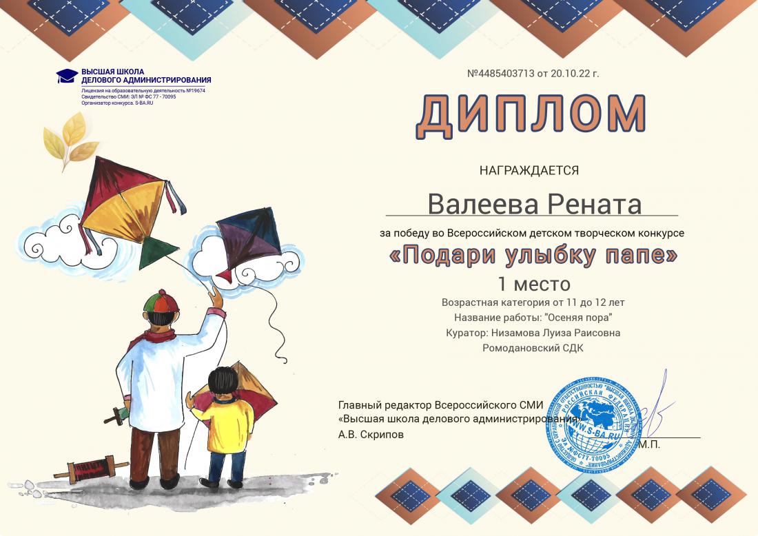 Диплом за 1 место в конкурсе "Подари улыбку папе", участница Валеева Р., педагог Валеева Л.И.