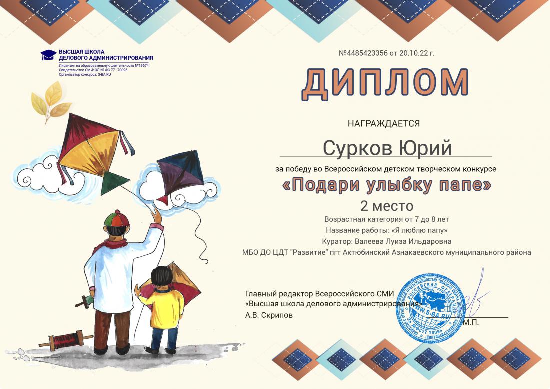 Диплом за 2 место в конкурсе "Подари улыбку папе", участник Сурков Ю., педагог Валеева Л.И.