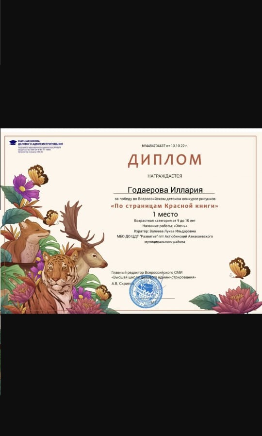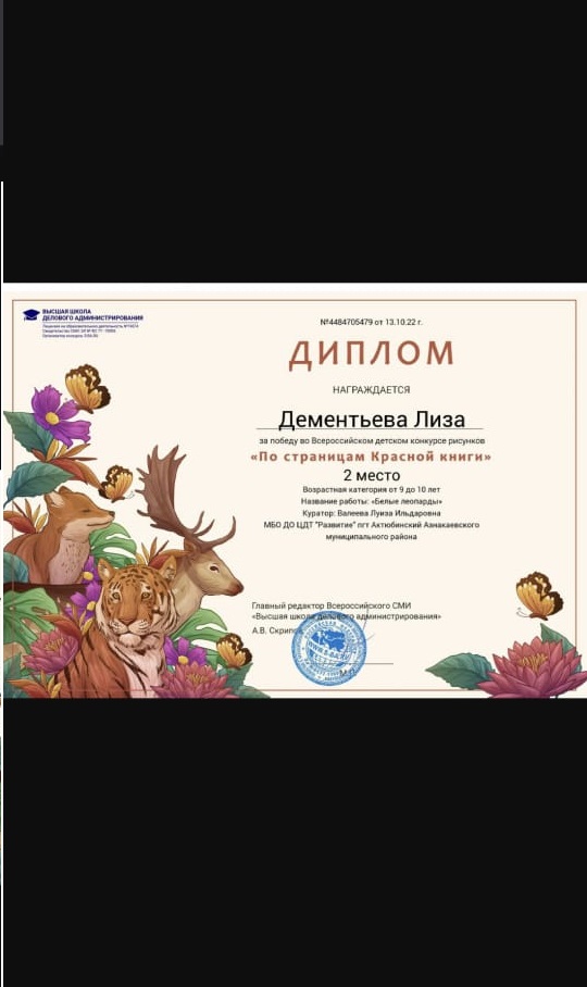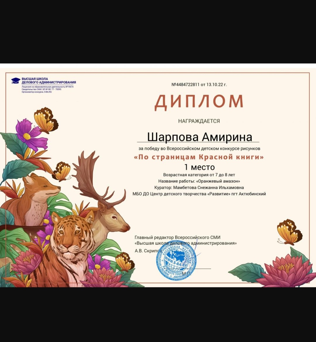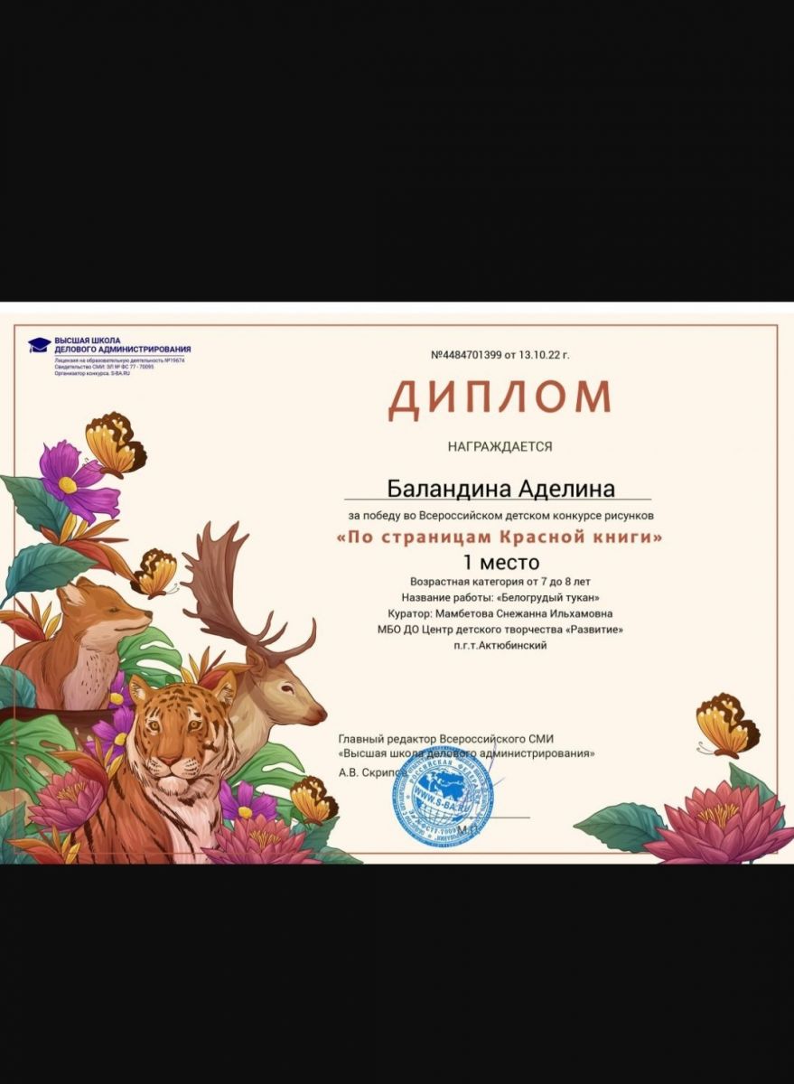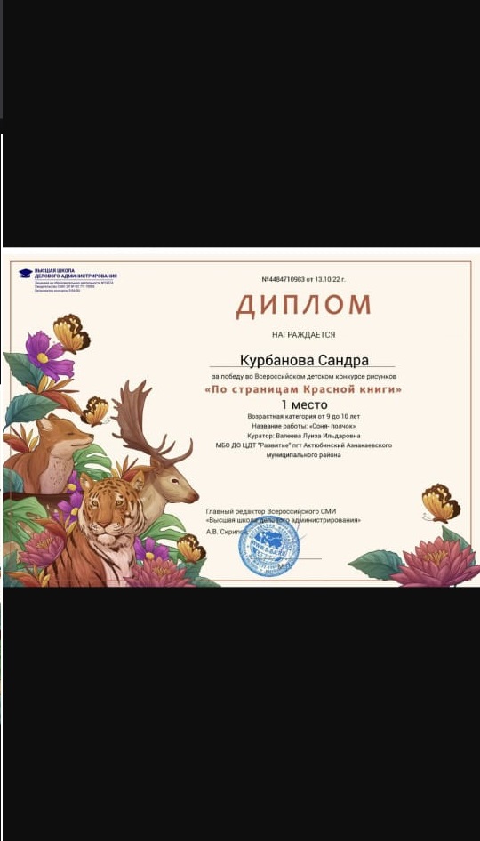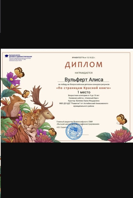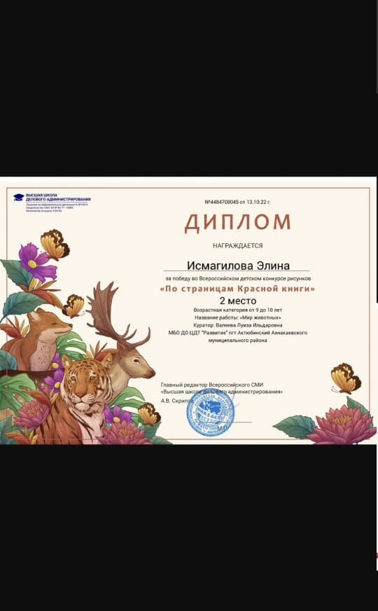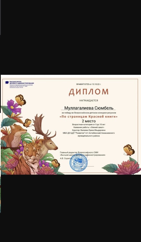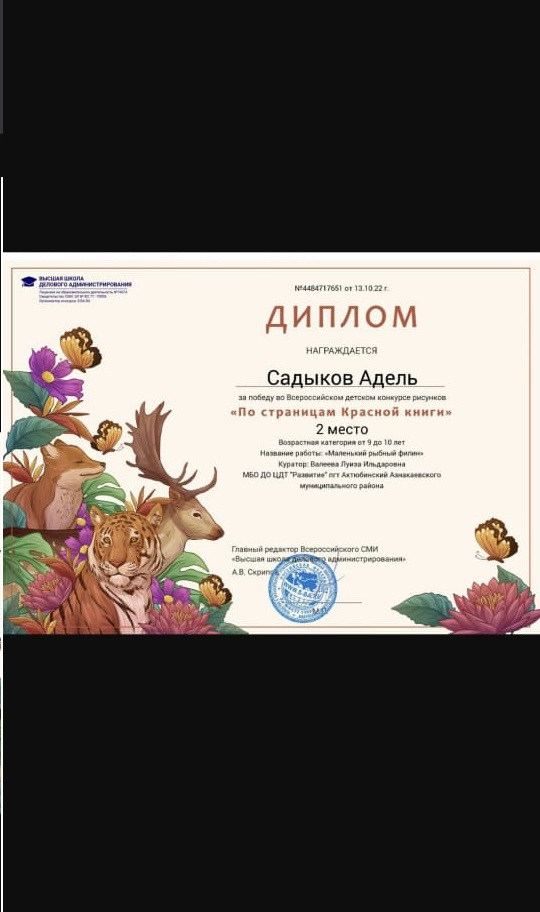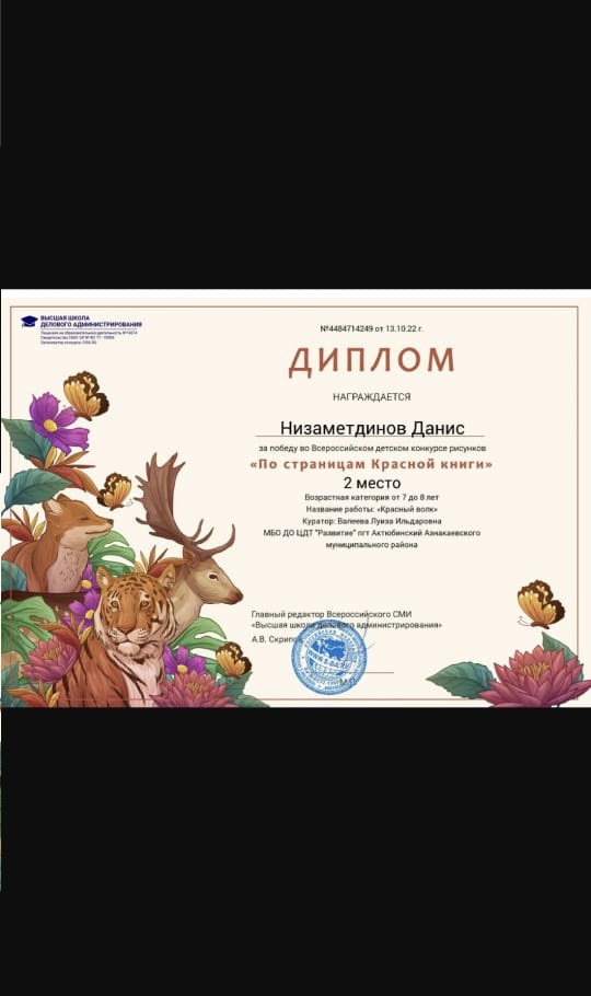 Диплом за 2 место в конкурсе "По страницам Красной книги", участник Садыков А., педагог Валеева Л.И.