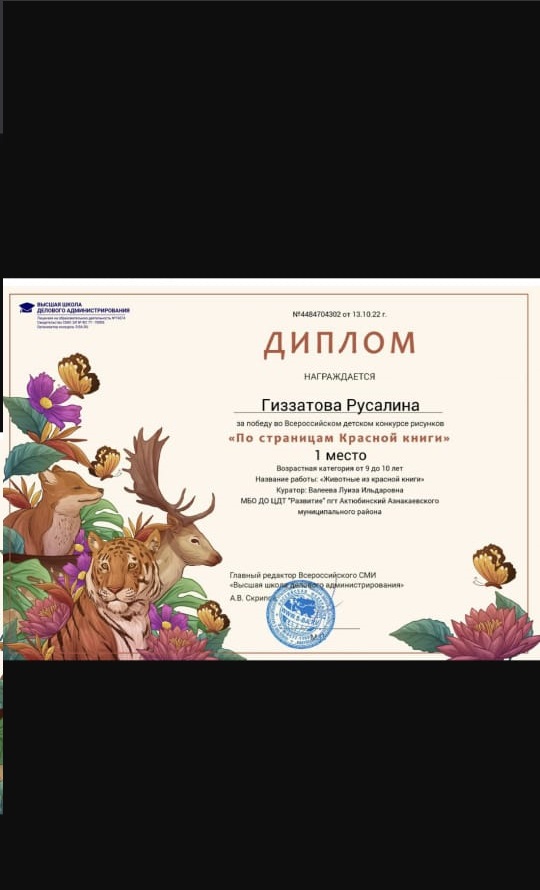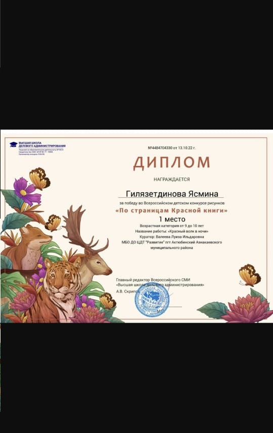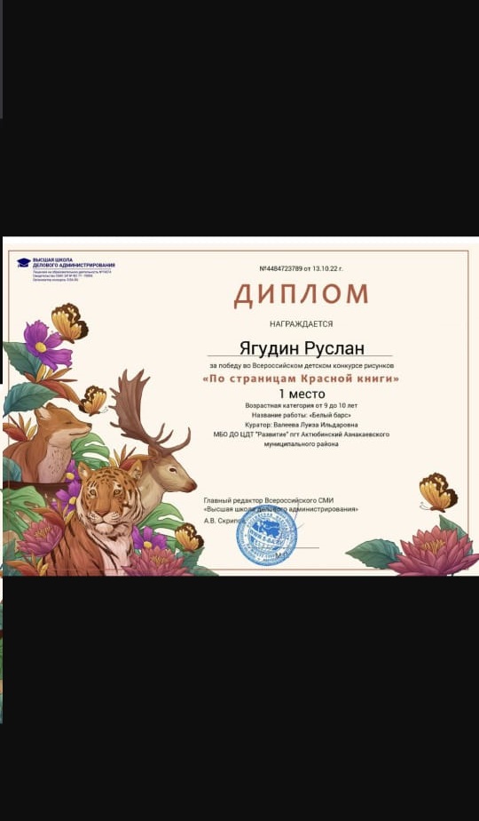 Диплом за 1 место в конкурсе "По страницам Красной книги", участник Ягудин Р., педагог Валеева Л.И.