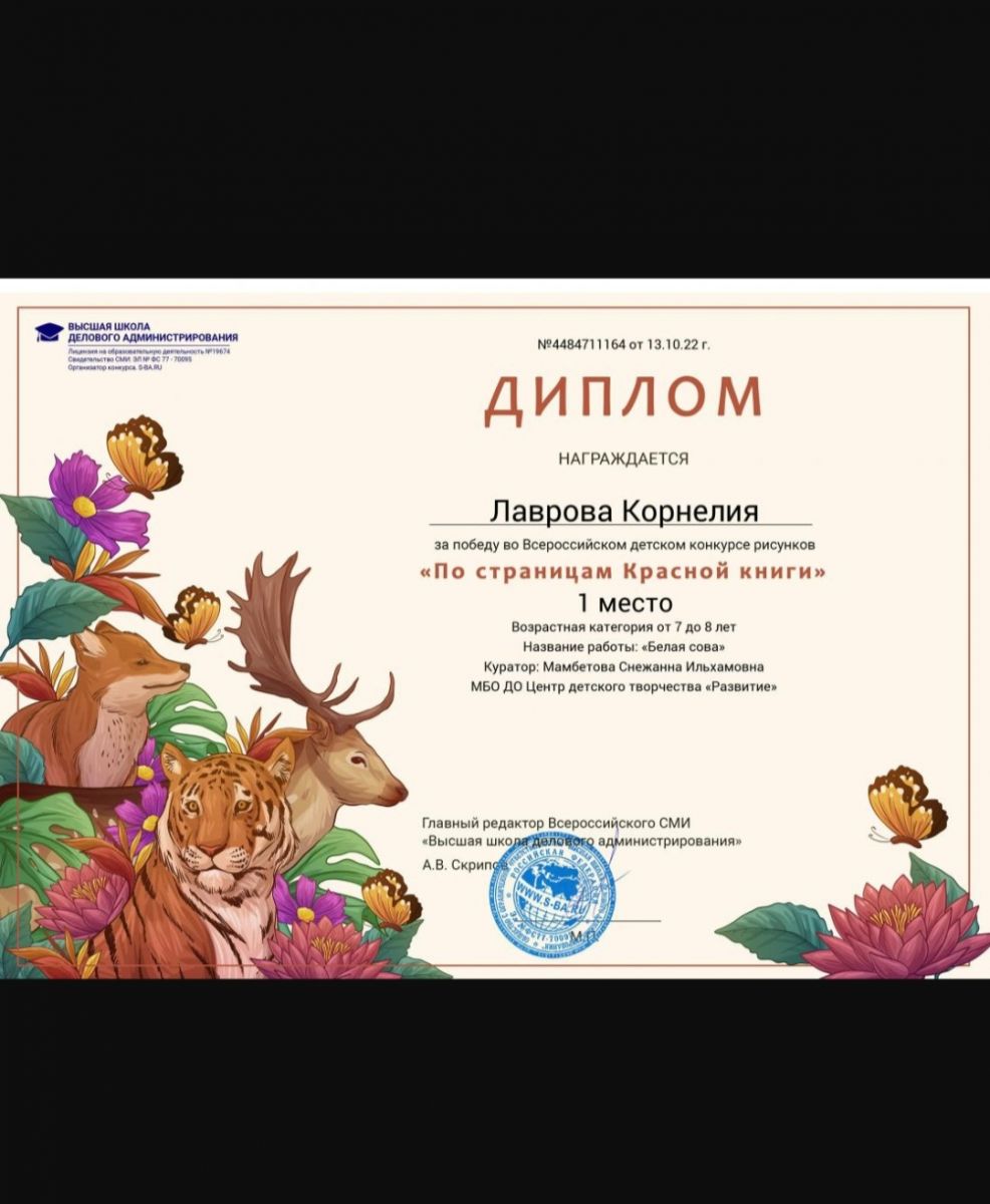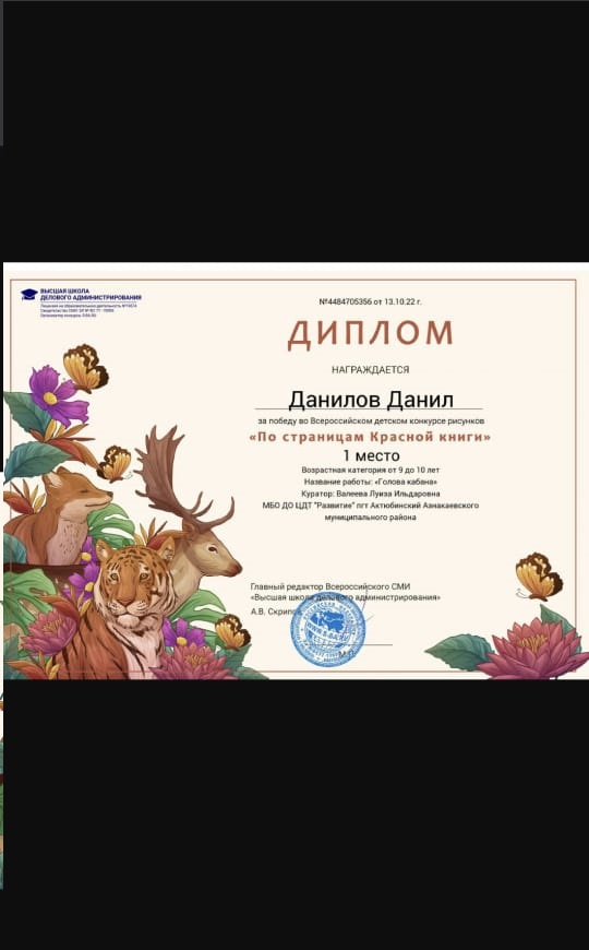 Диплом за 1 место в конкурсе "По страницам Красной книги", участник Данилов Д., педагог Валеева Л.И.