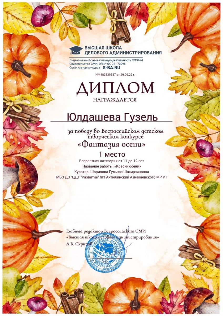 Диплом за 1 место в конкурсе "Фантазия осени", участница Юлдашева Г., педагог Шарипова Г.Ш.