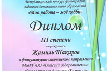По итогам республиканского конкурса коллажей педагогов дополнительного образования "Моя работа - моё хобби" ПДО Бахтиева А.И. награждена грамотой за творческий подход, тренер-преподаватель Шакиров Ж.В. - дипломом 3 степени.