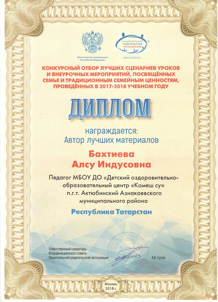 Диплом автору лучших материалов посвященных семейным ценностям, 2018г., Бахтиева А.И.