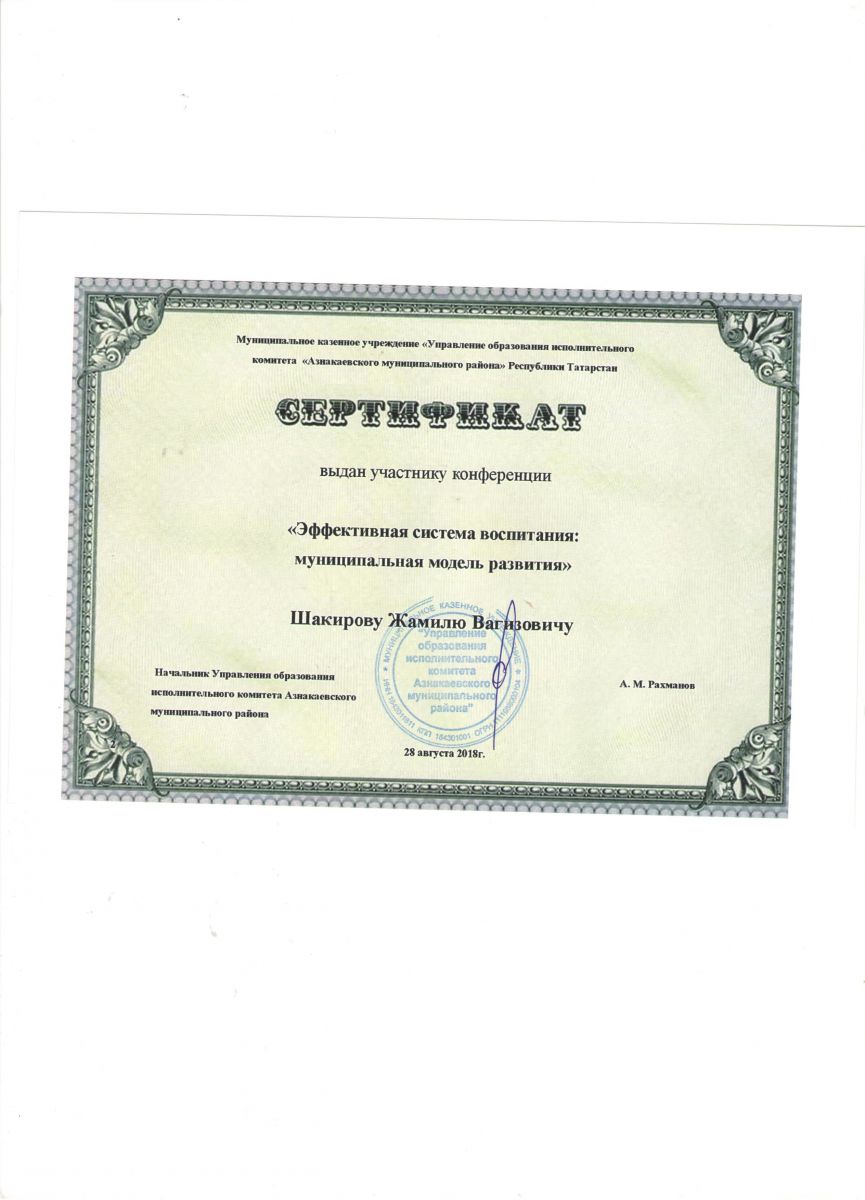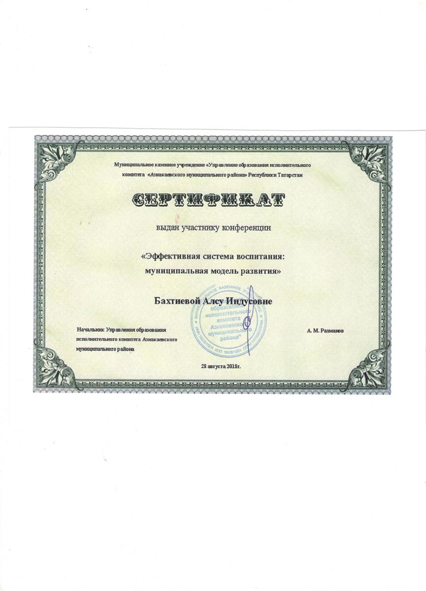 Сертификат участнику конференции "Эффективная система воспитания", 2018г., Бахтиева А.И.