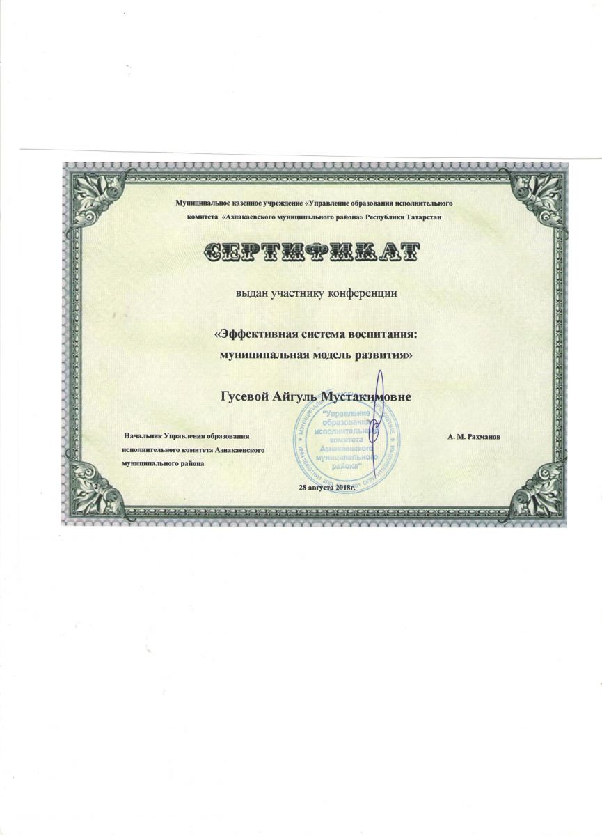 Сертификат участнику конференции "Эффективная система воспитания", 2018г., Гусева А.М.
