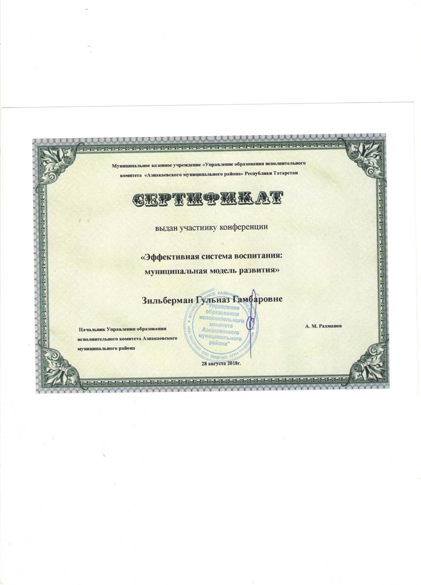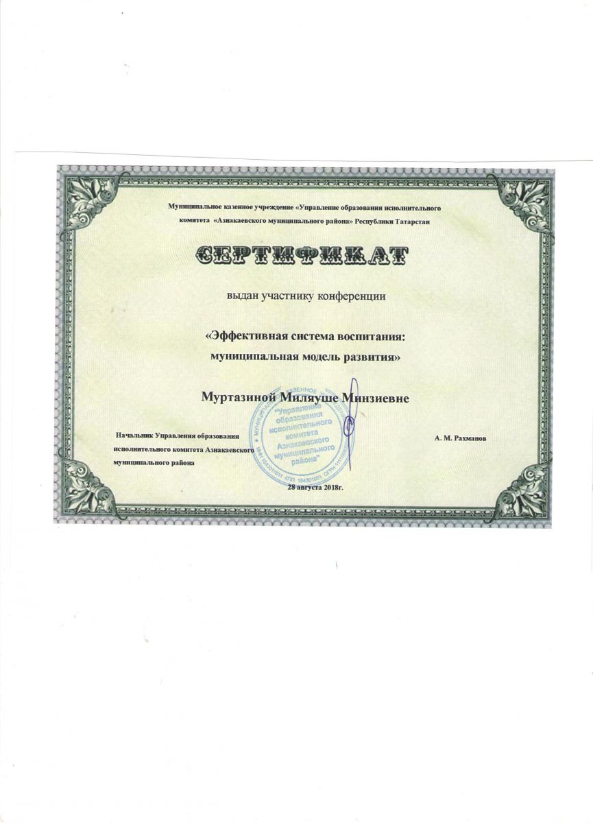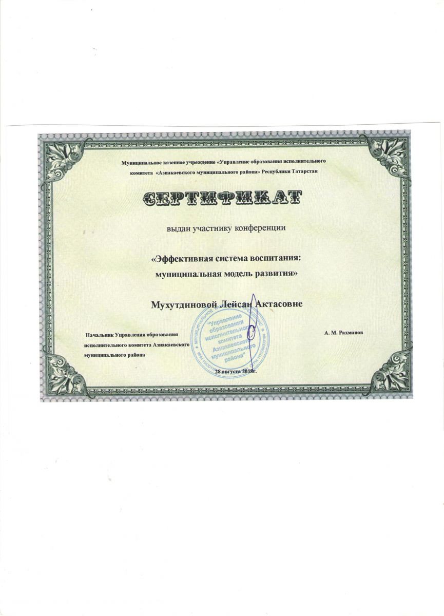 Сертификат участнику конференции "Эффективная система воспитания", 2018г., Мухутдинова Л.А.