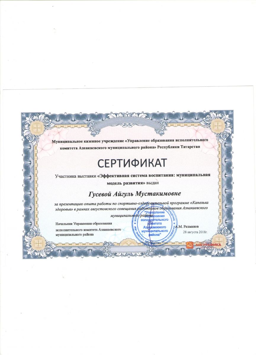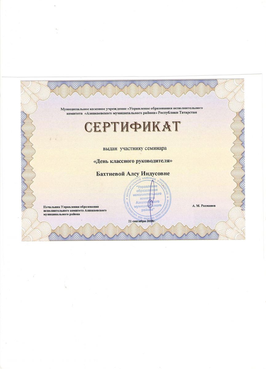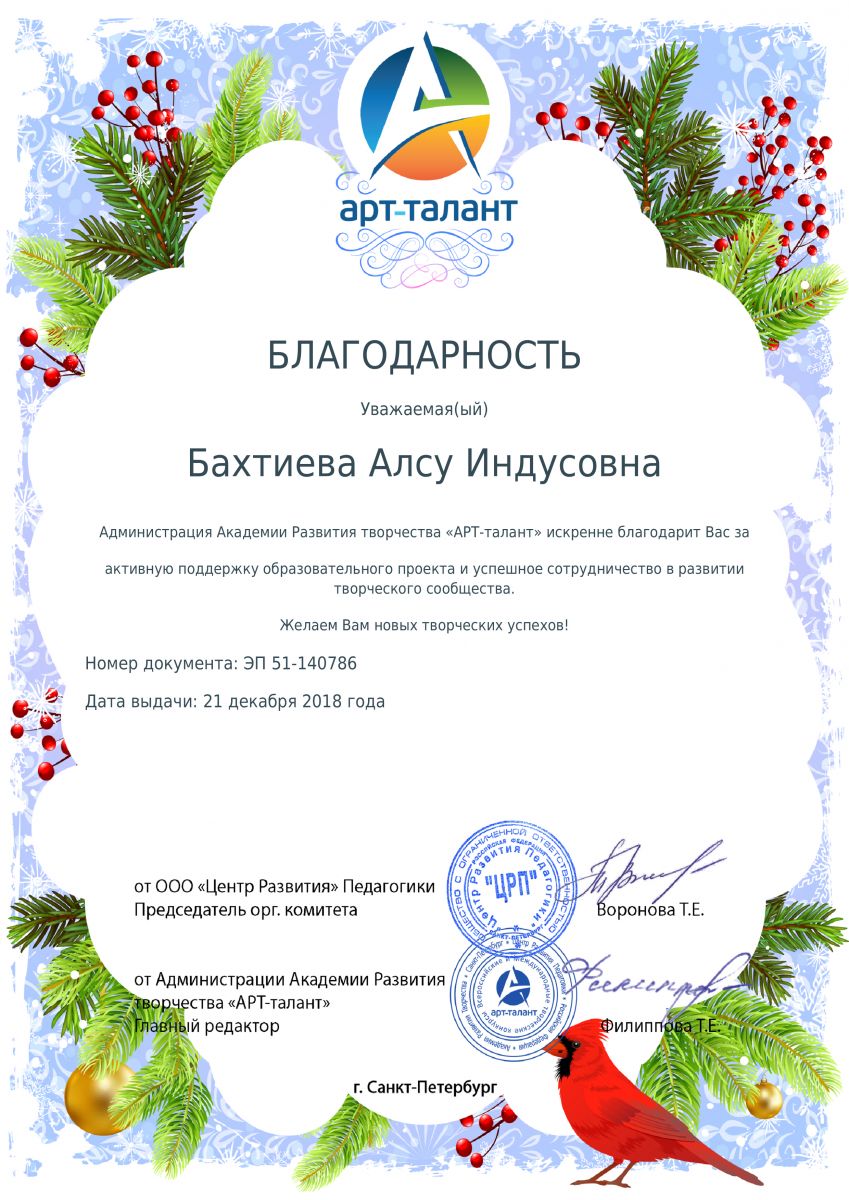 Благодарность за поддержку образовательного проекта, 2018г., Бахтиева А.И.