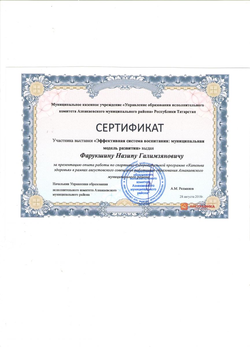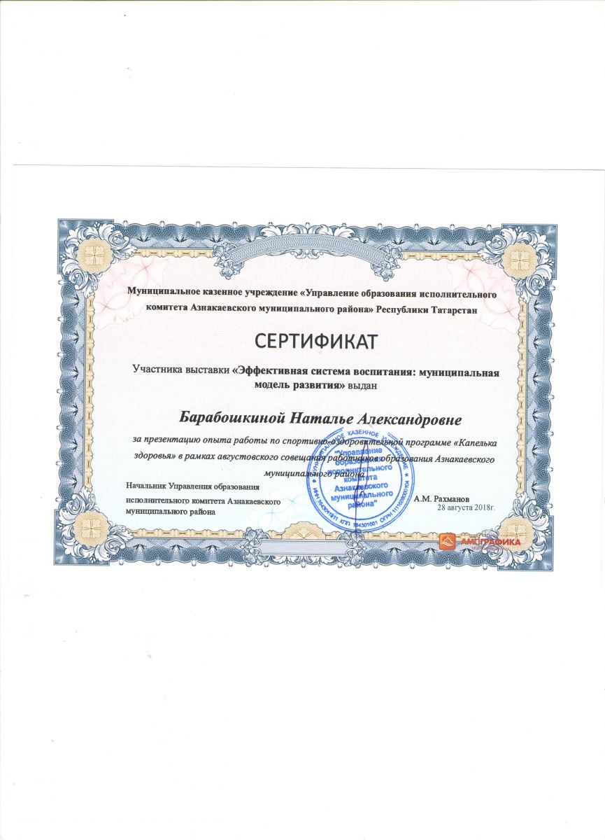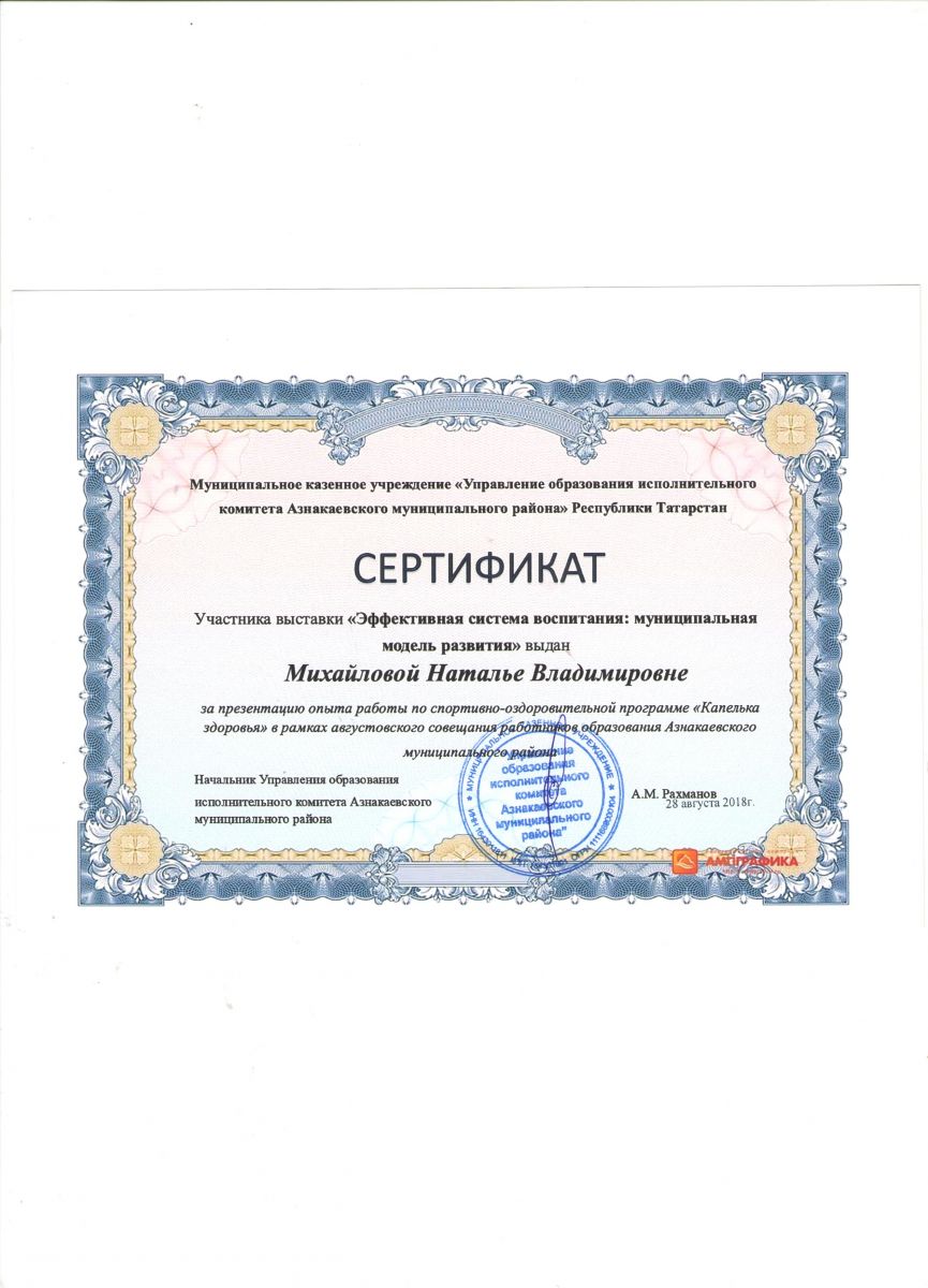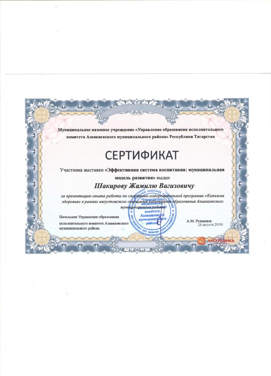 Благодарность за поддержку образовательного проекта, 2018г., Бахтиева А.И.