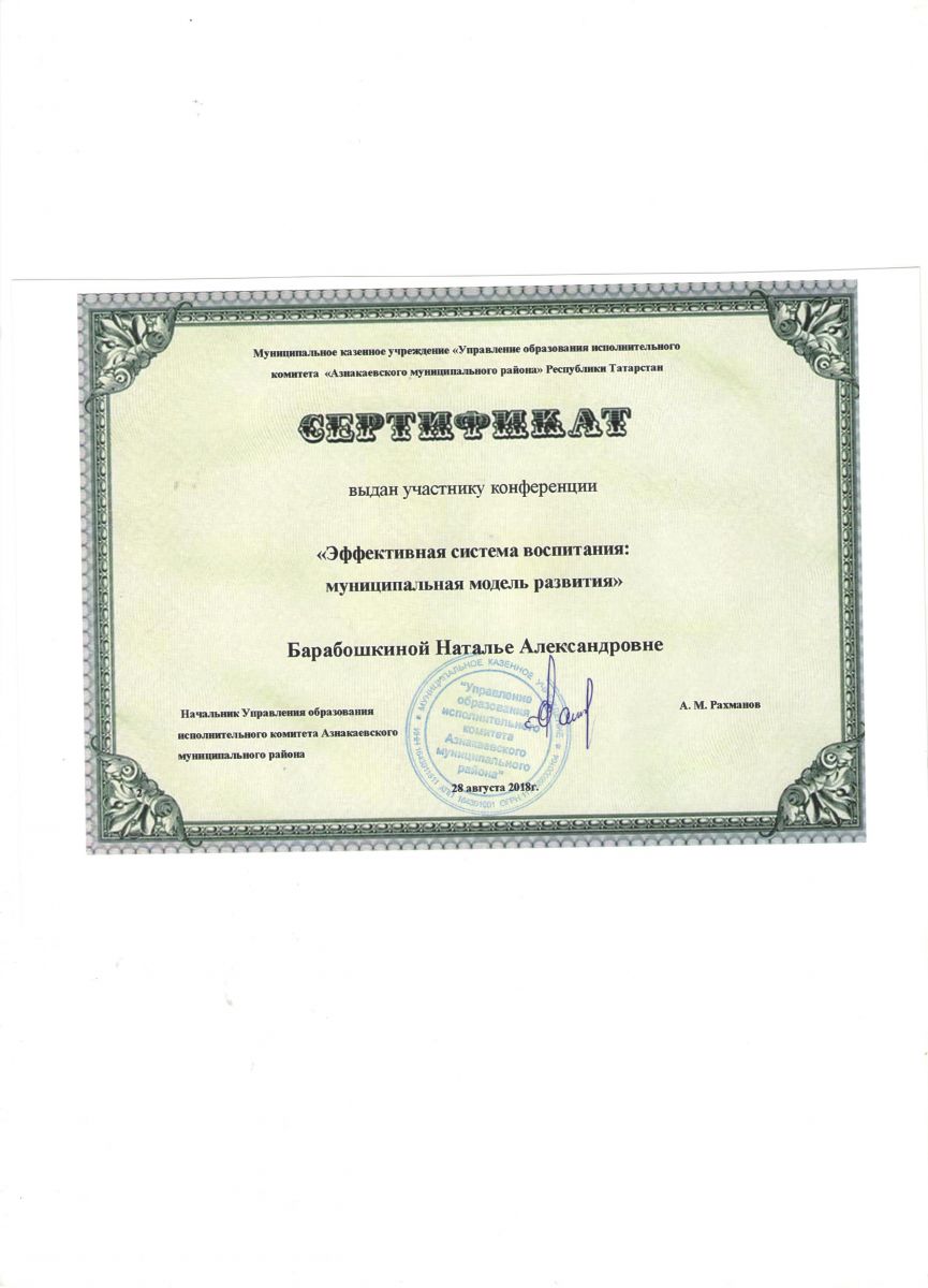 Сертификат участнику конференции "Эффективная система воспитания", 2018г., Барабошкина Н.А.