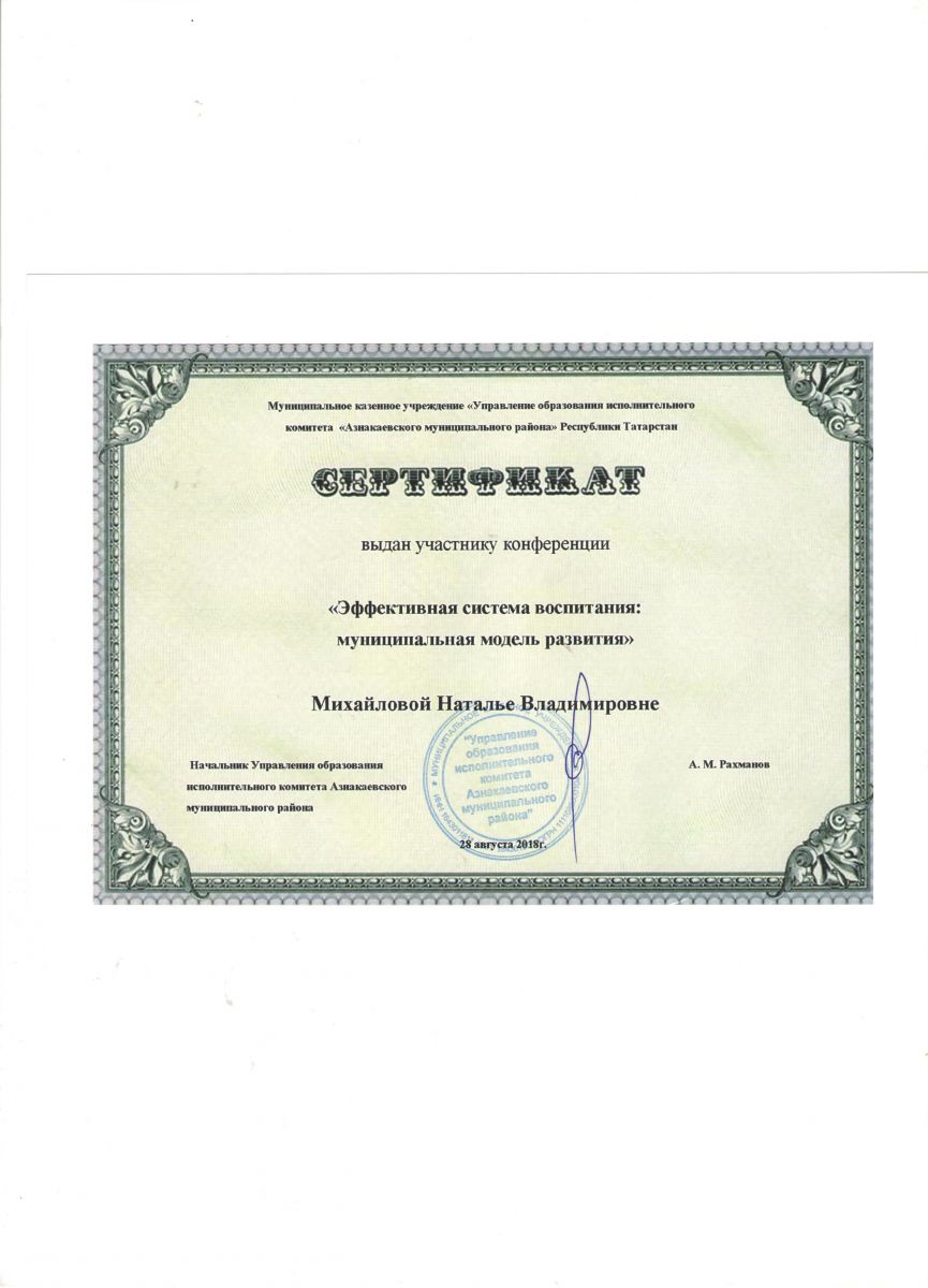 Сертификат участнику конференции "Эффективная система воспитания", 2018г., Михайлова Н.В.