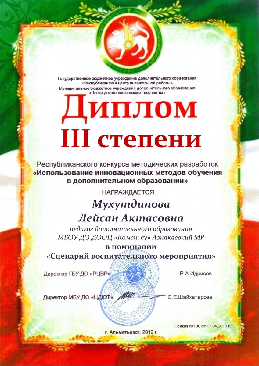 Диплом 3 степени в конкурсе методических разработок, 2019г., Мухутдинова Л.А.