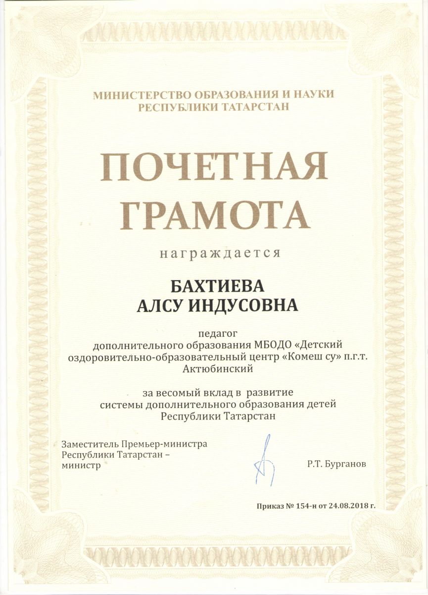 Почетная грамота, 2018г., Бахтиева А.И.
