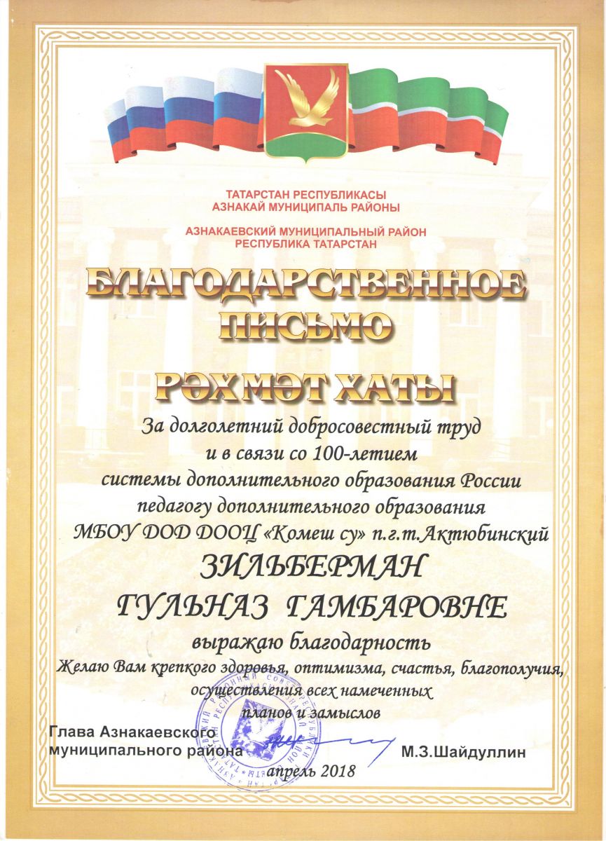 Благодарственное письмо за долголетний добросовестный труд, 2018г., Зильберман Г.Г.