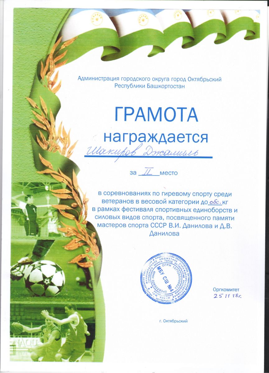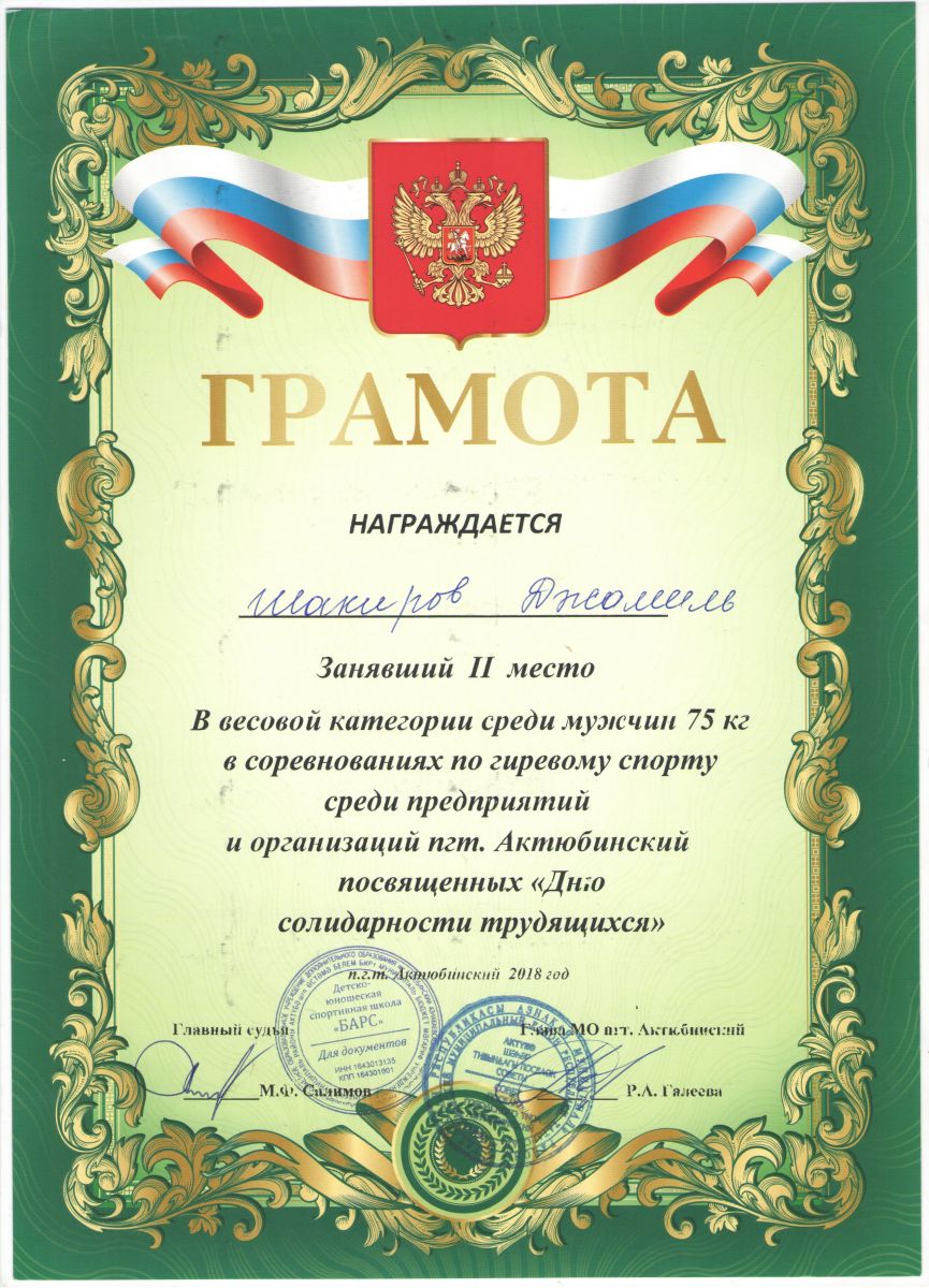 Грамота за 2 место в соревнованиях по гиревому спорту среди организаций, 2018г., Шакиров Ж.В.