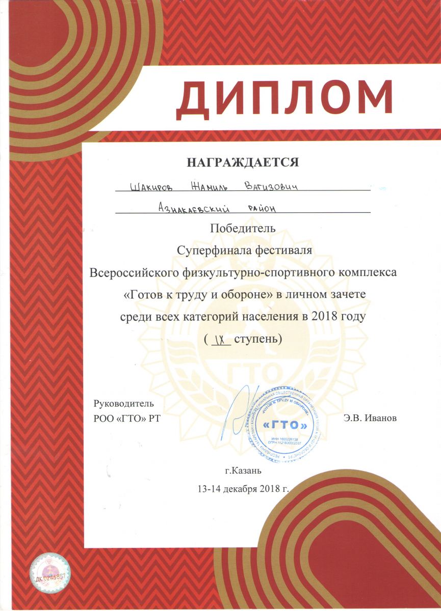 Диплом победителя суперфинала фестиваля ГТО, 2018г., Шакиров Ж.В.