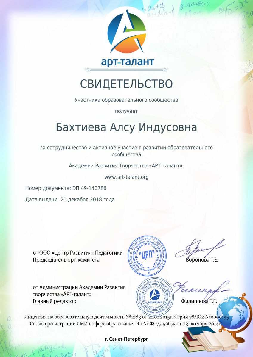 Свидетельство за участие в развитии образовательного сообщества, 2018г., Бахтиева А.И.