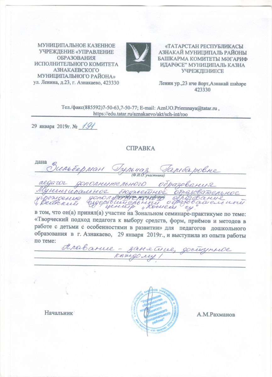 Справка об участии на семинаре-практикуме, 2019г., Зильберман Г.Г.
