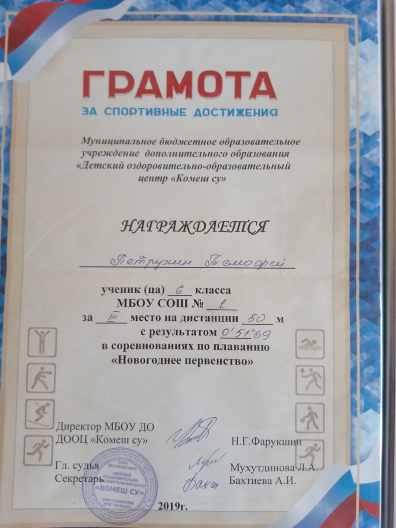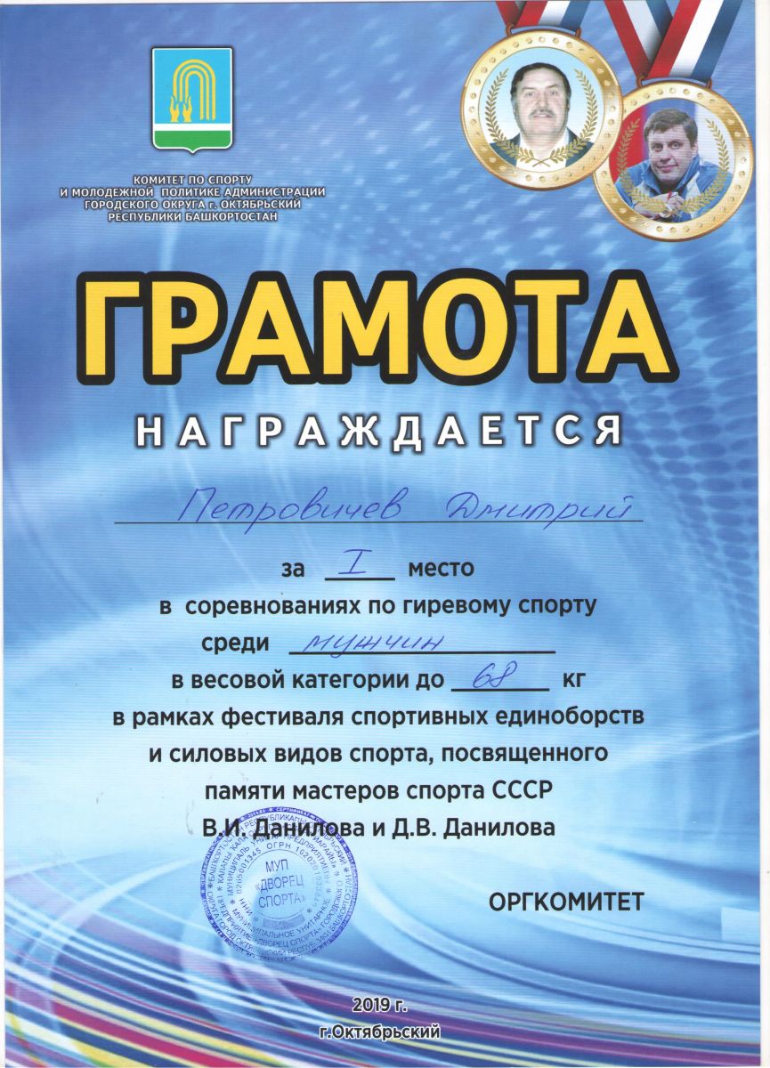 Грамота 1 место республиканские соревнования по гиревому спорту, Петровичев Д., 2019г.