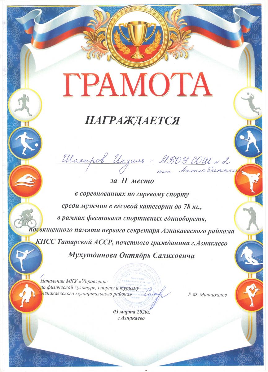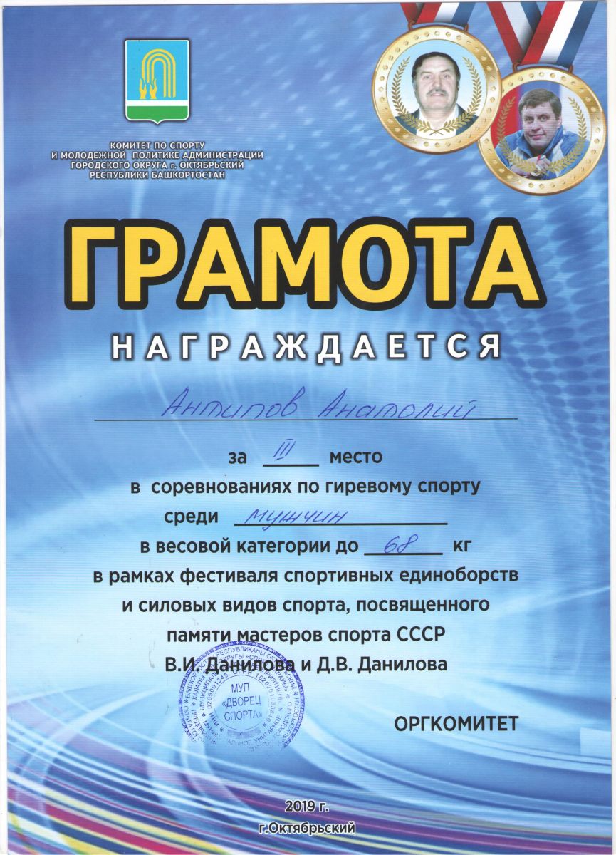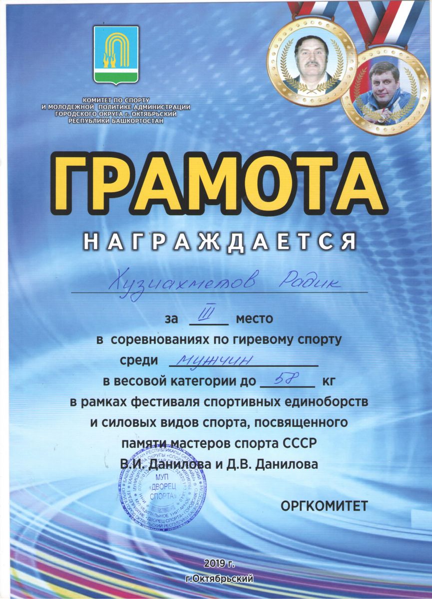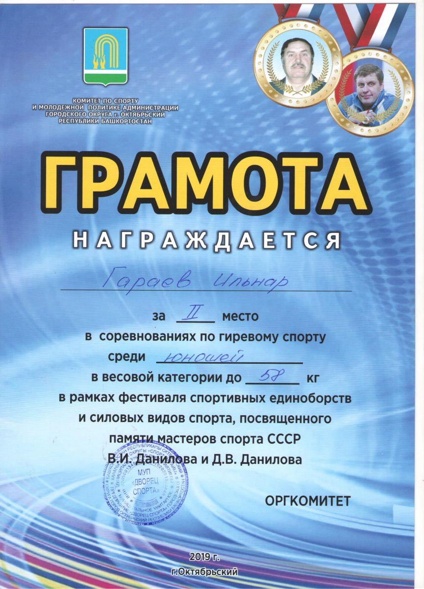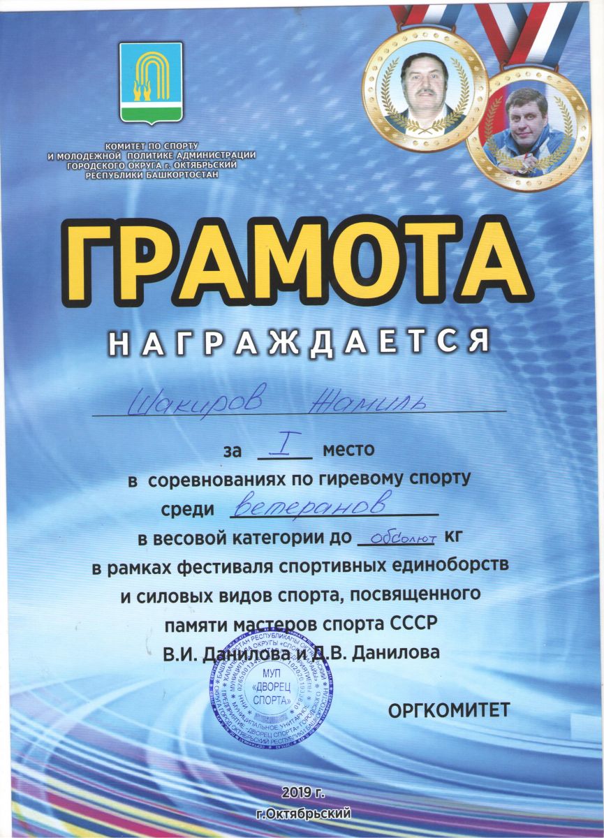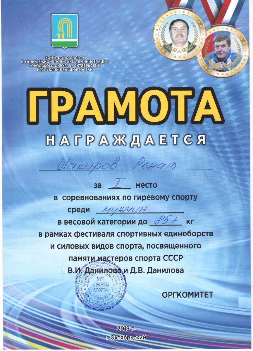 Грамота 1 место республиканские соревнования по гиревому спорту, Шакиров Р., 2019г.