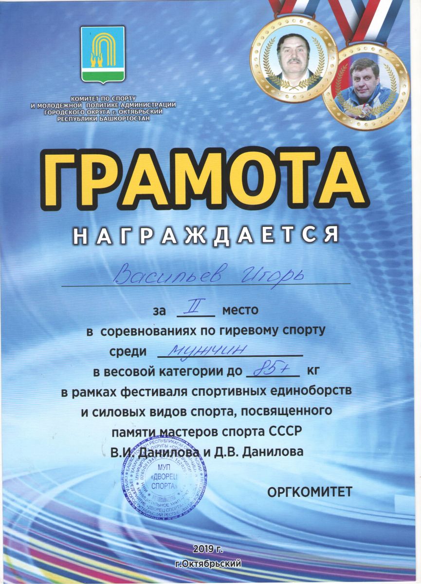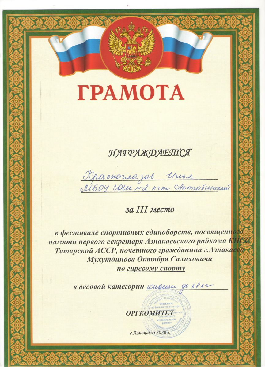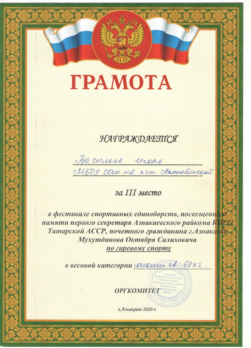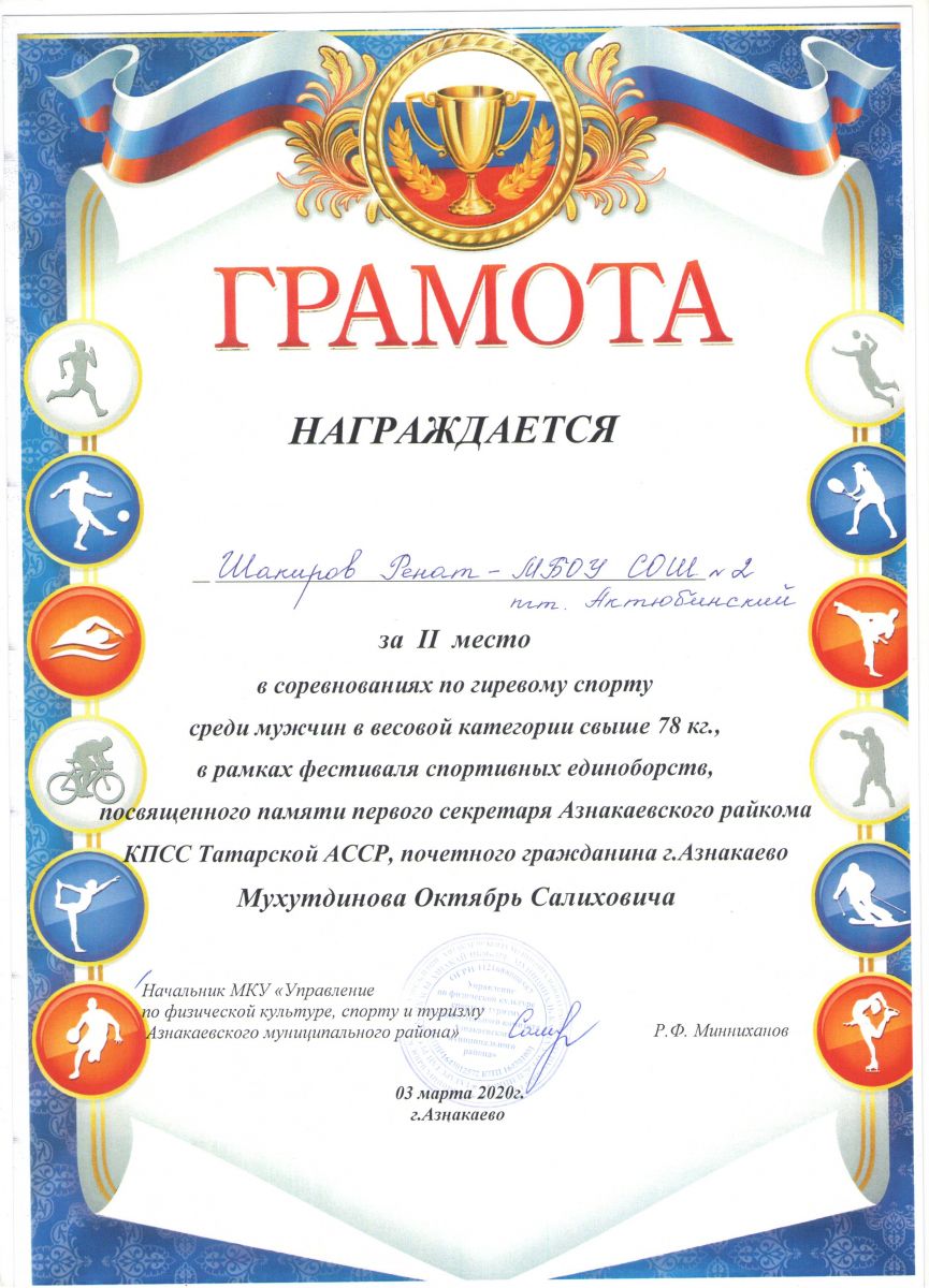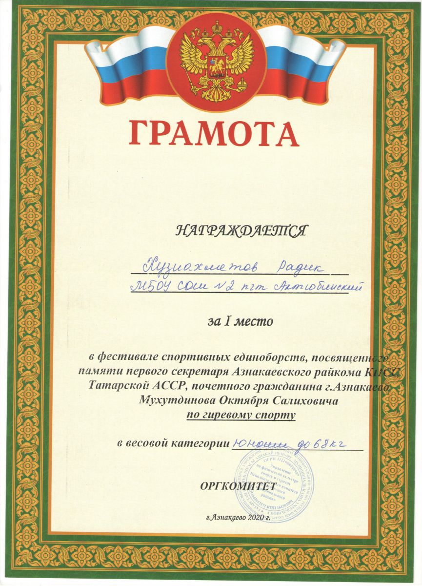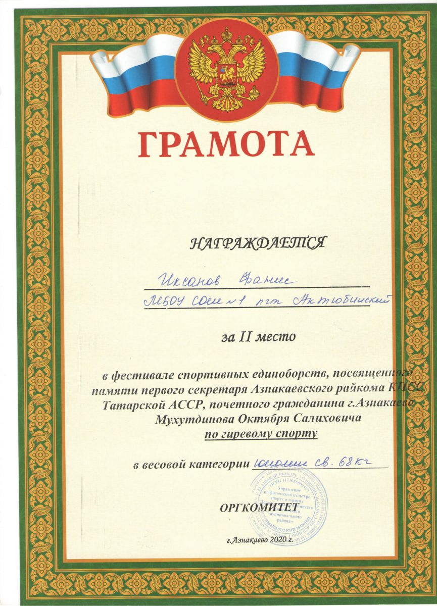 Грамота 1 место республиканские соревнования по гиревому спорту, Шакиров Р., 2019г.