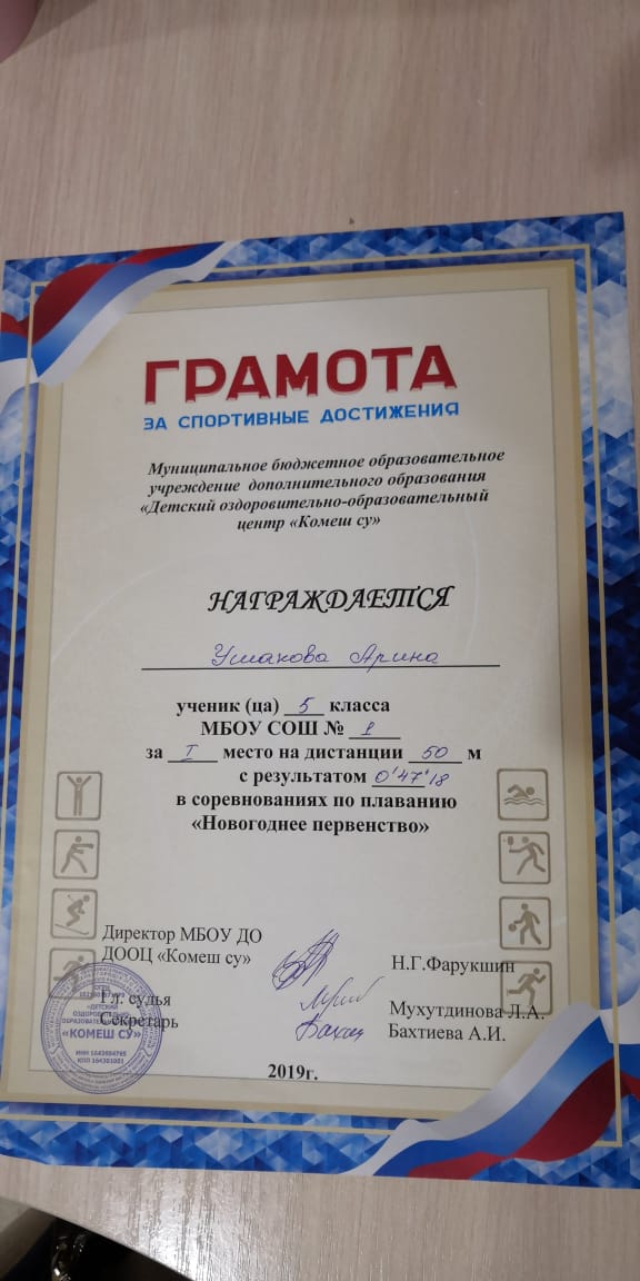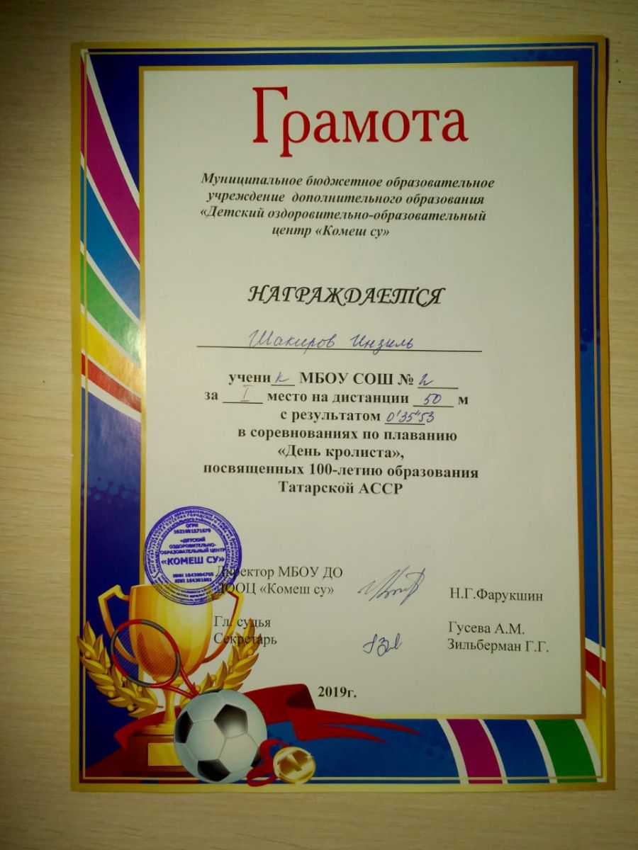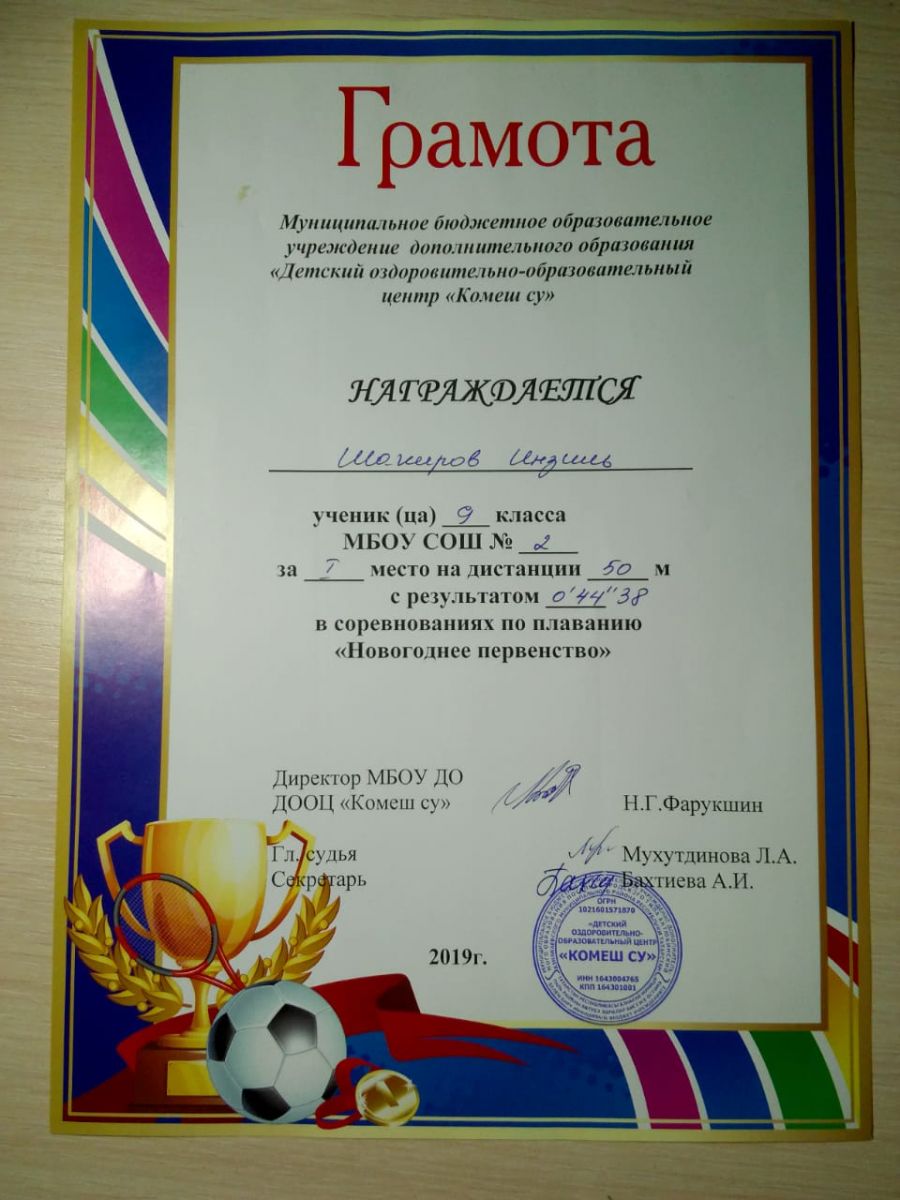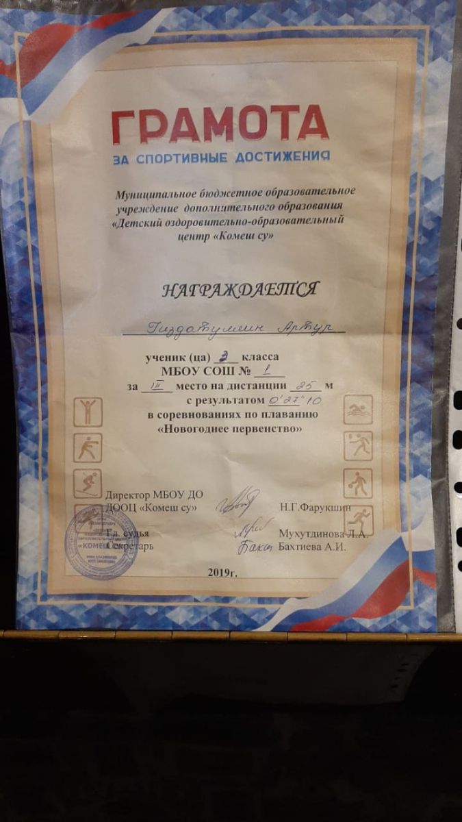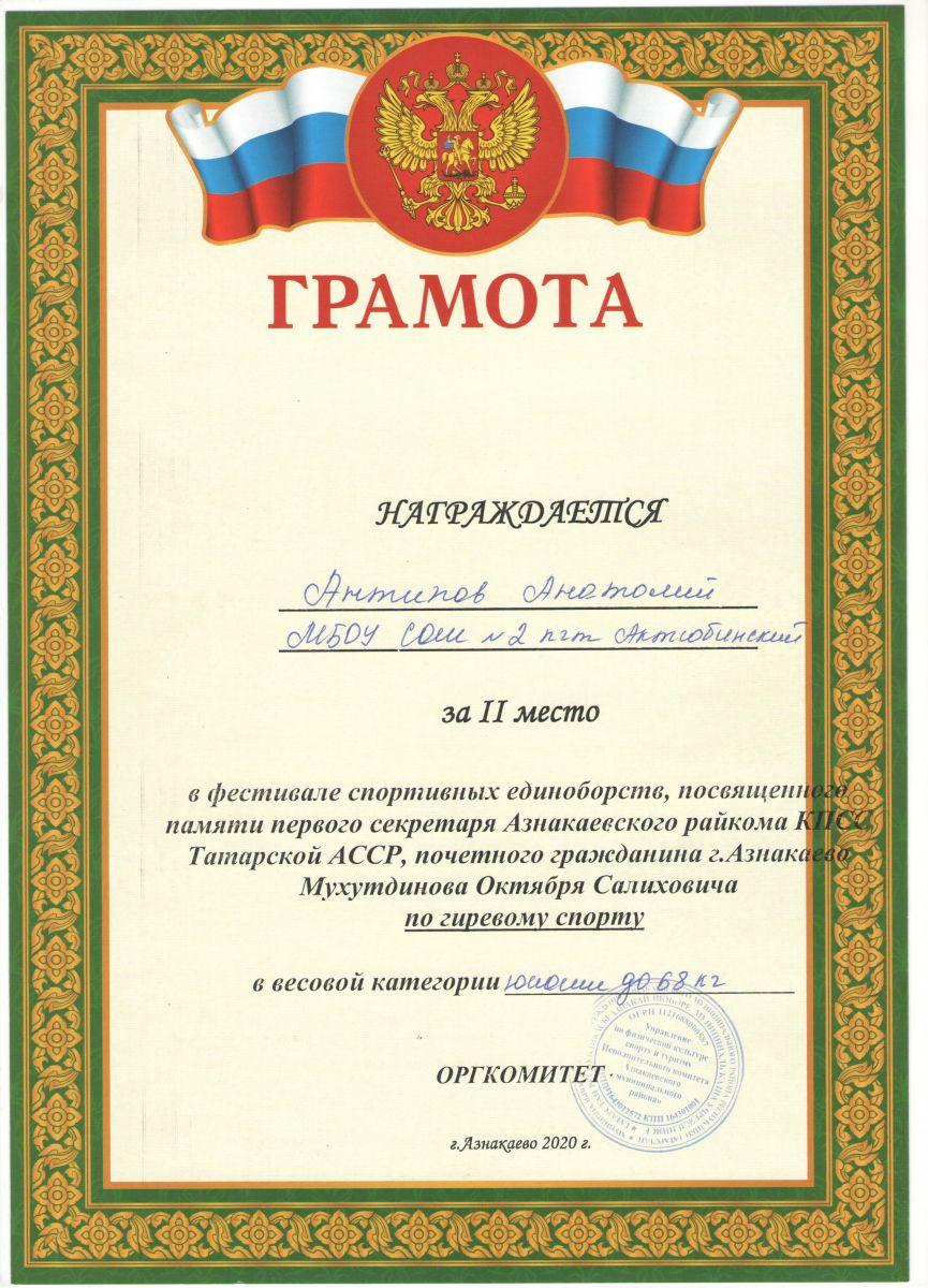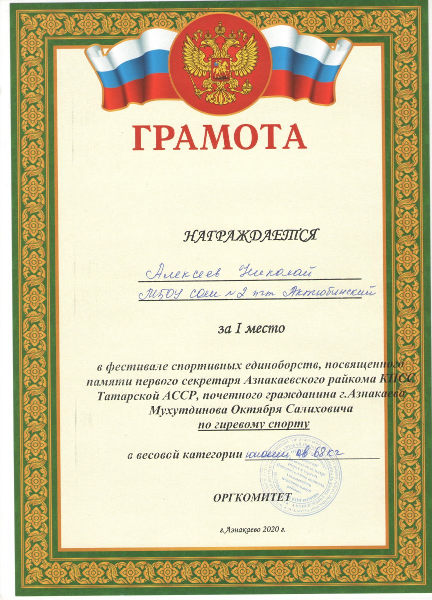Грамота 1 место республиканские соревнования по гиревому спорту, Шакиров Р., 2019г.