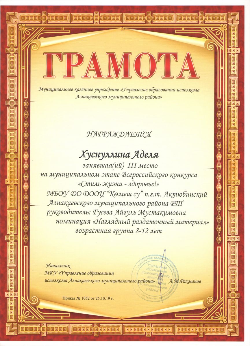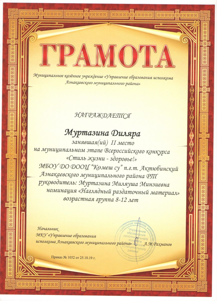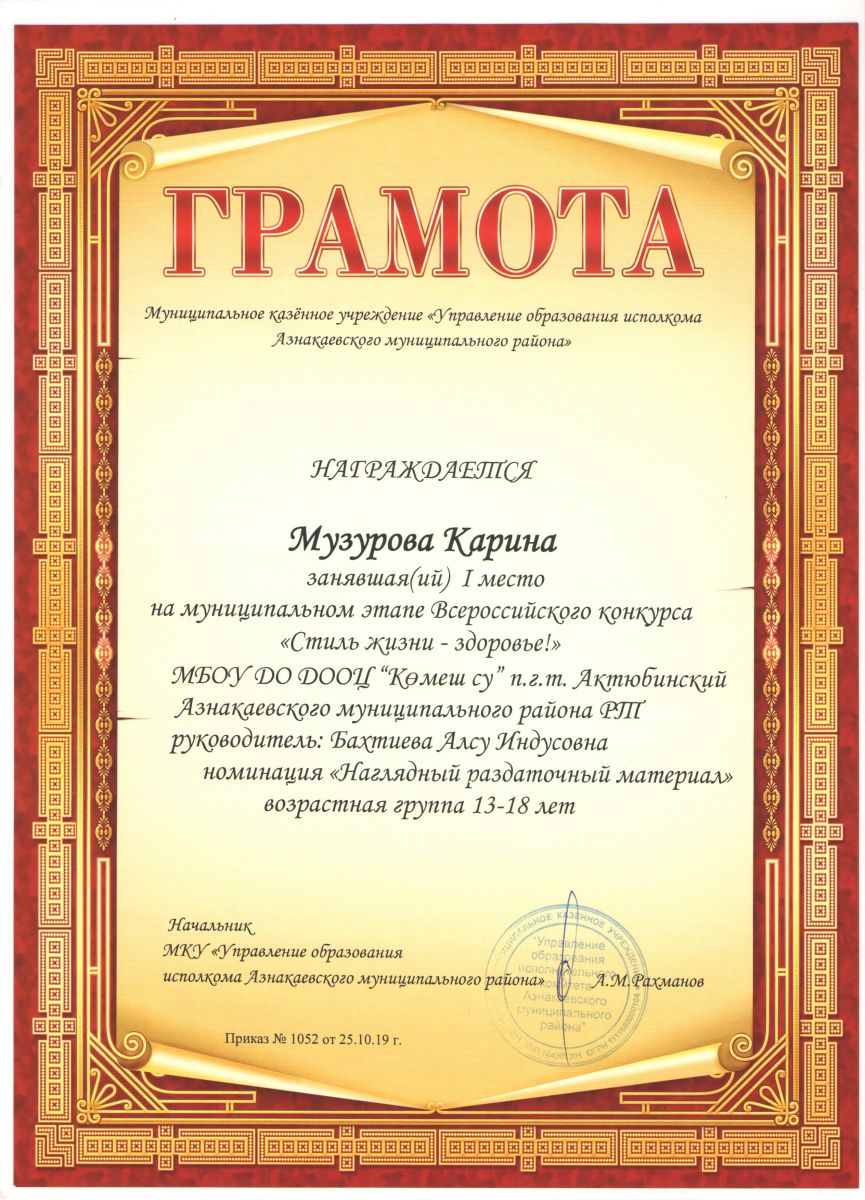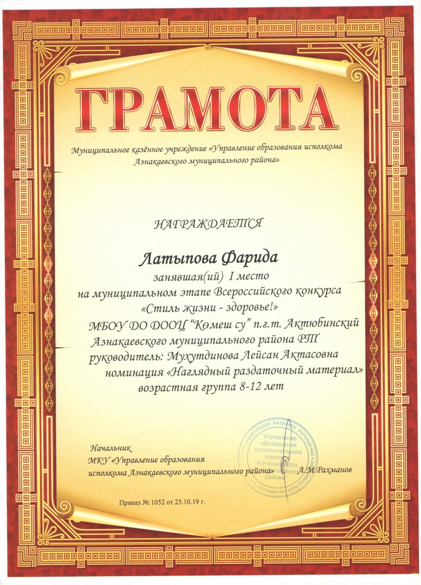 Грамота 1 место Всероссийского конкурса "Стиль жизни - здоровье", Латыпова Ф., 2019г.