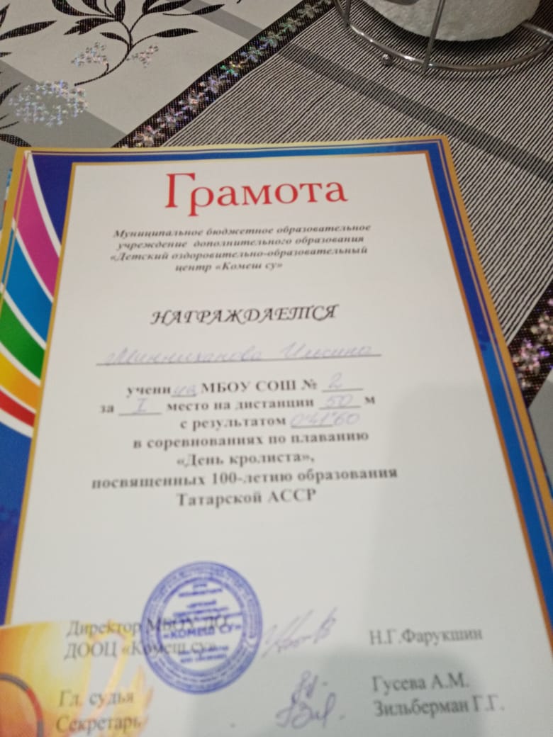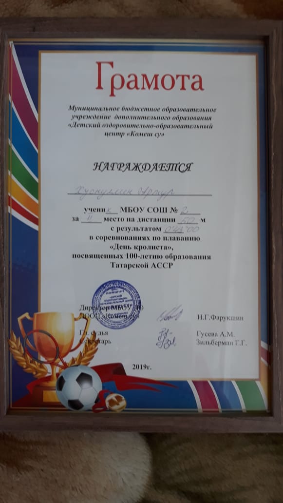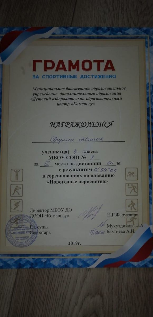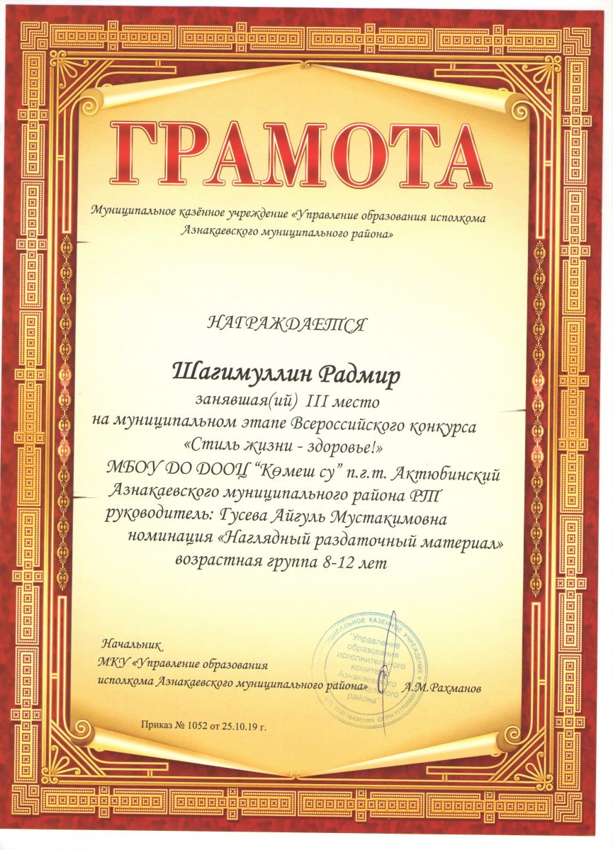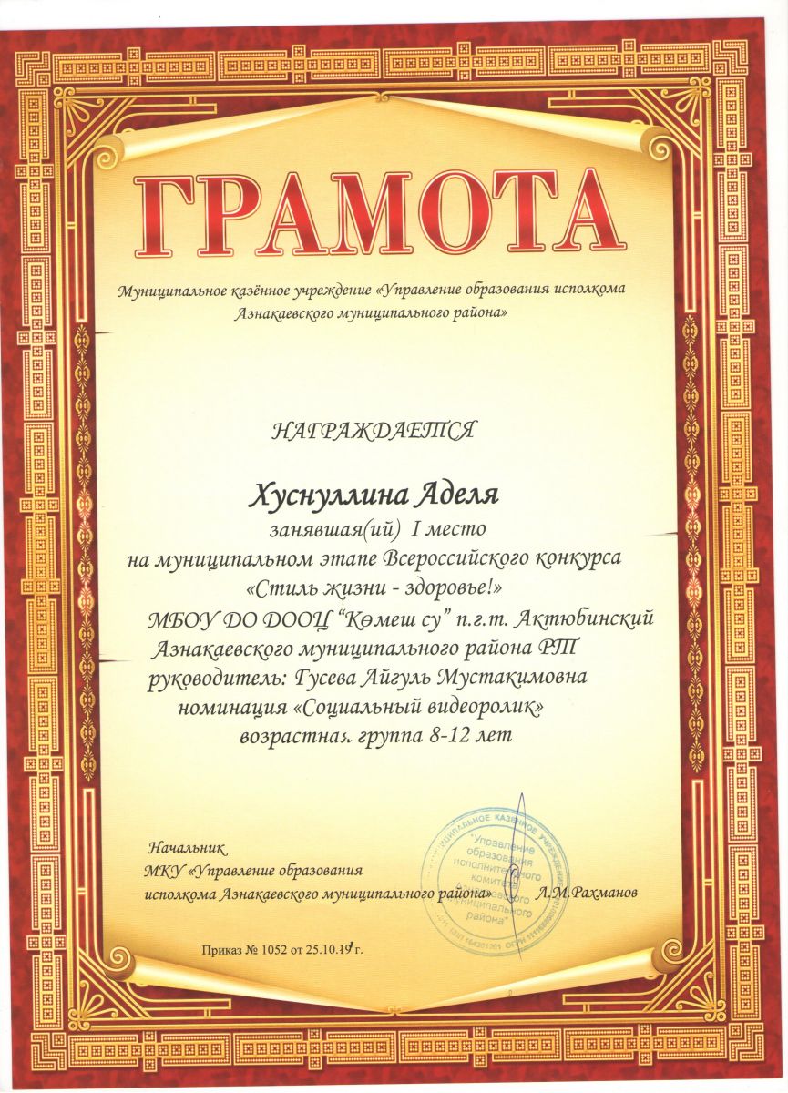 Грамота 1 место Всероссийского конкурса "Стиль жизни - здоровье", Латыпова Ф., 2019г.