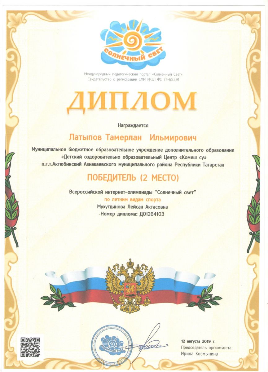 Диплом 2 место Всероссийской интернет-олимпиады, Латыпов Т., 2019г.