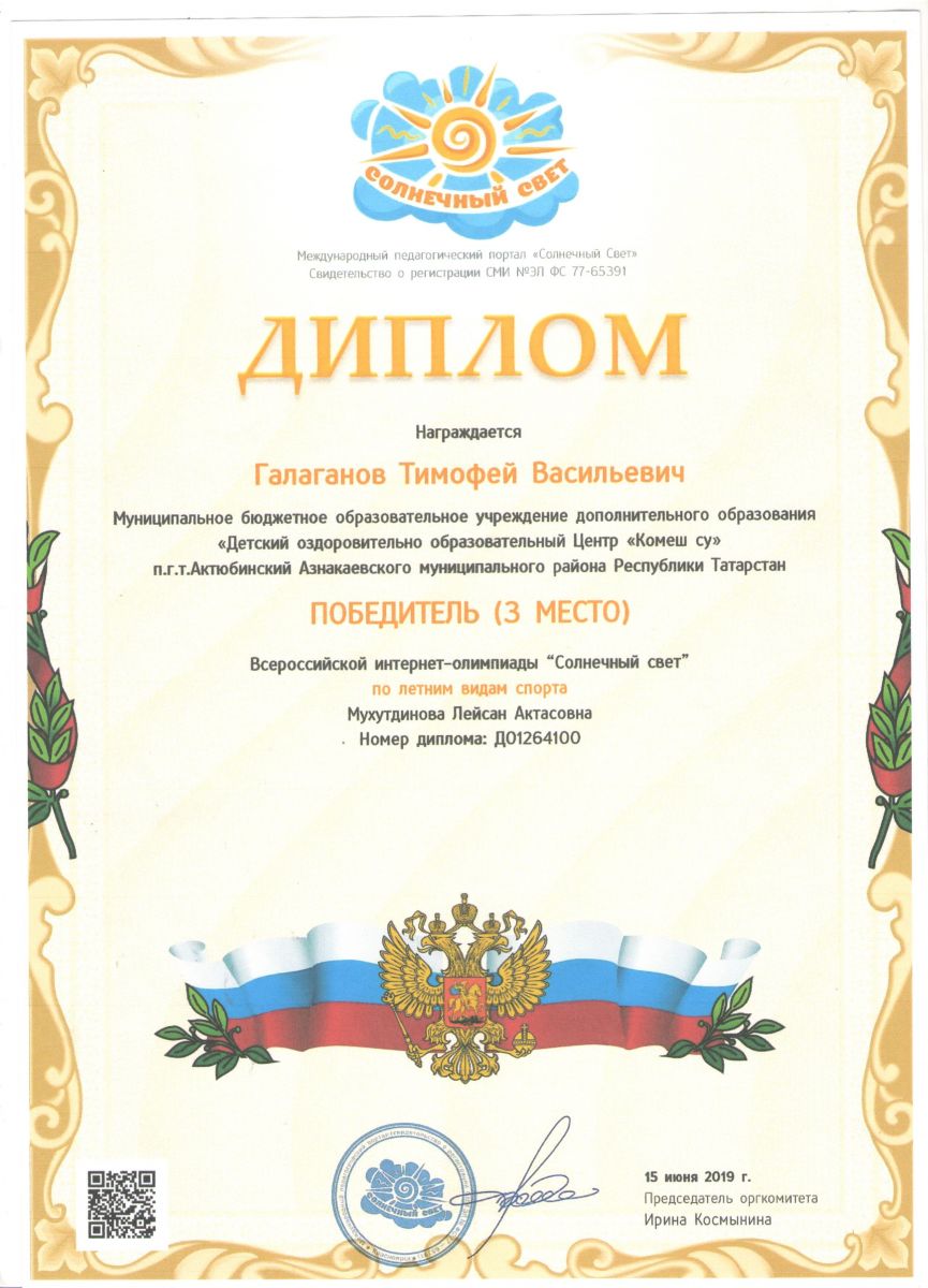 Диплом 3 место Всероссийской интернет-олимпиады, Галаганов Т., 2019г.