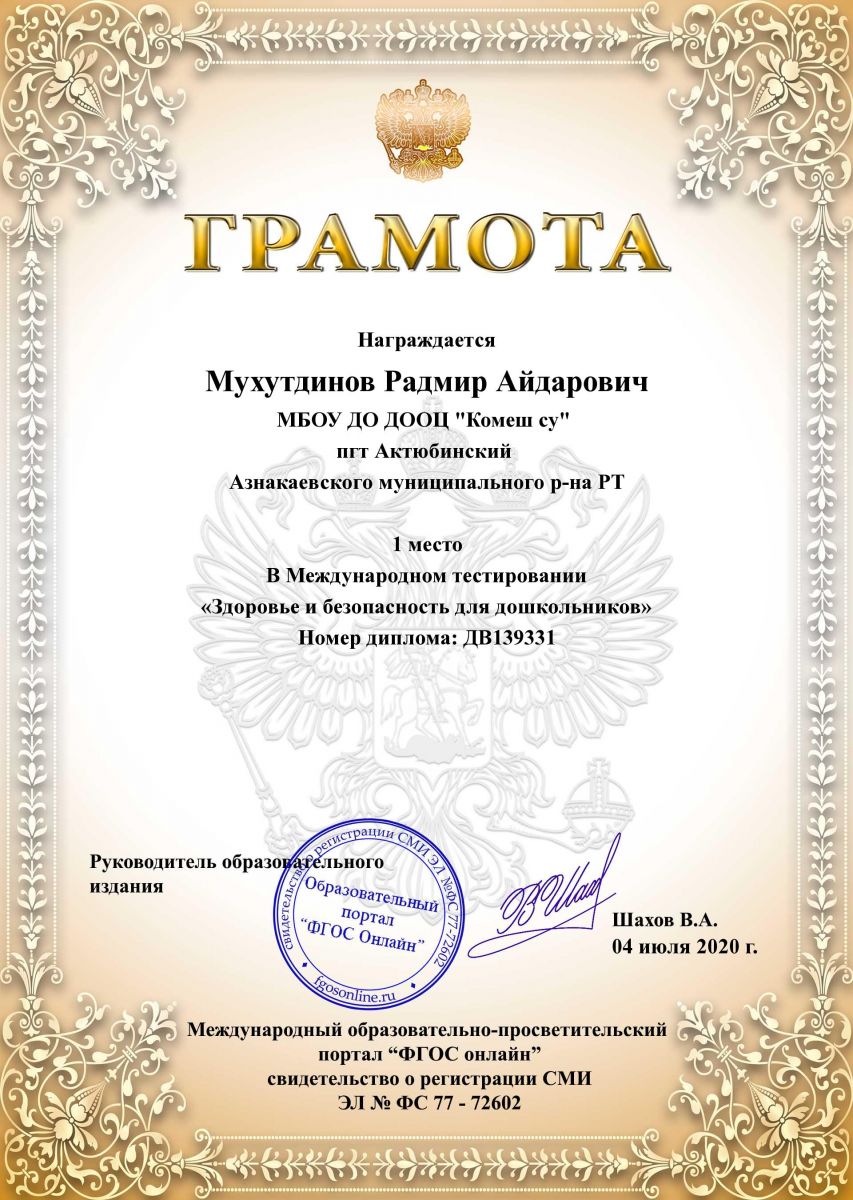 Грамота 1 место в международном тестировании, Мухутдинов Р., 2020г.