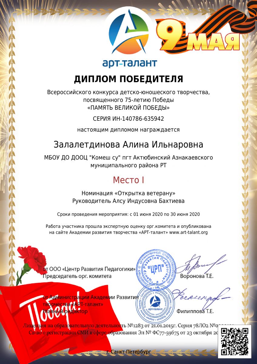 Диплом 1 место Всероссийского конкурса "Память великой победы", Залалетдинова А., 2020г.