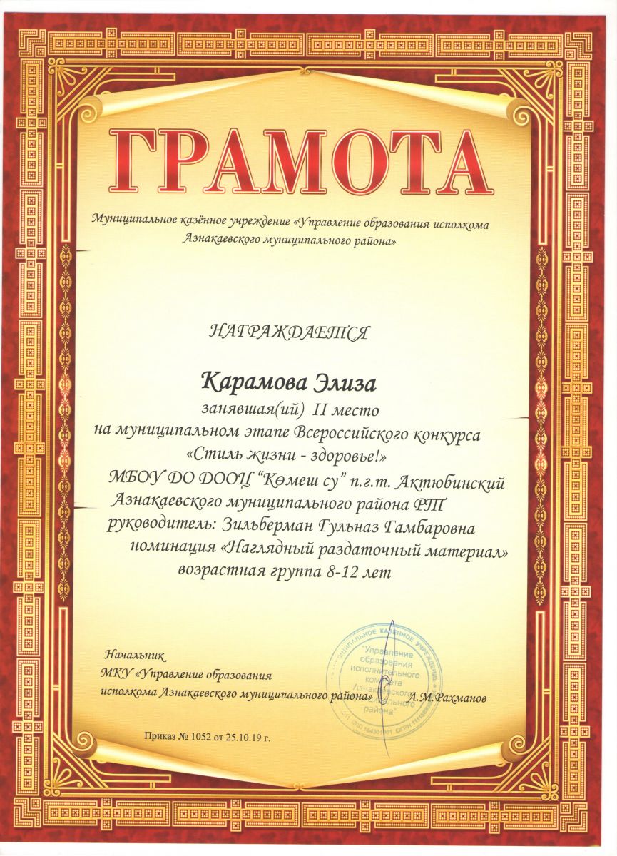 Грамота 2 место Всероссийского конкурса "Стиль жизни - здоровье", Карамова Э., 2019г.