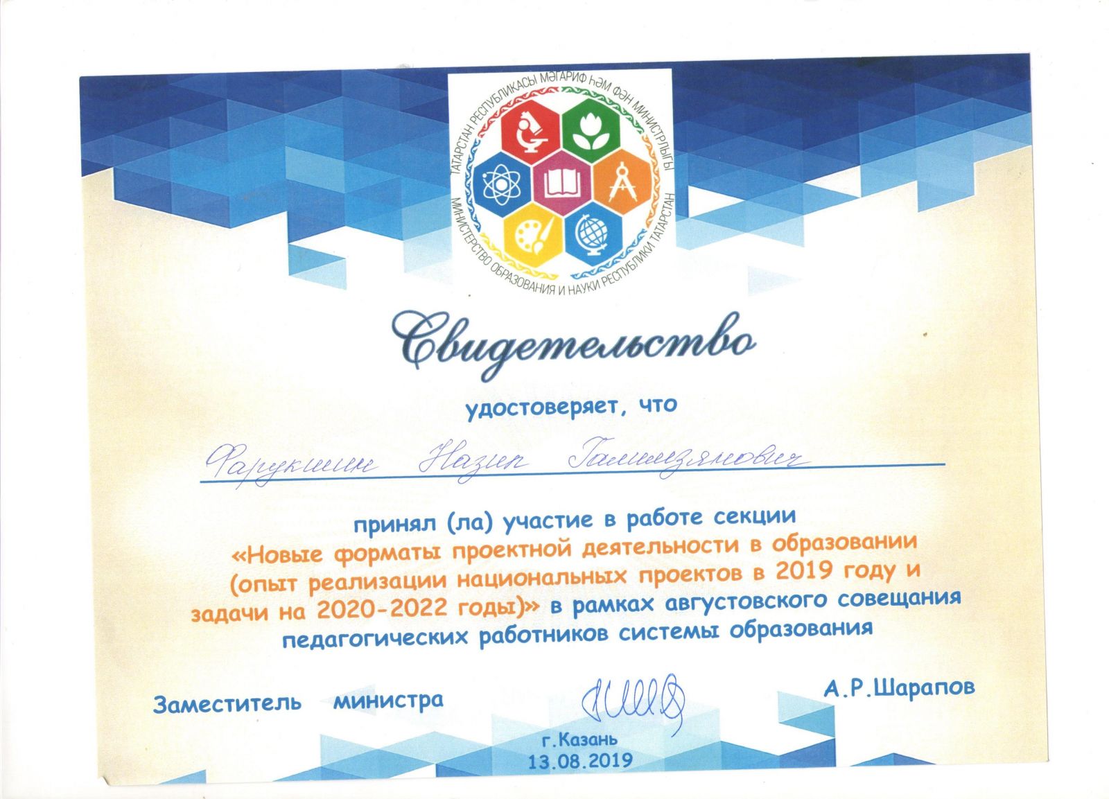 Свидетельство об участии в работе секции, Фарукшин Н.Г., 2019г.
