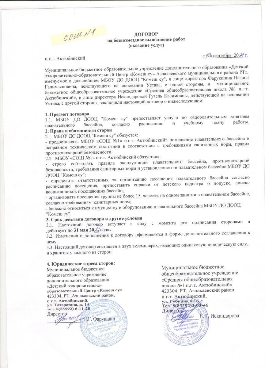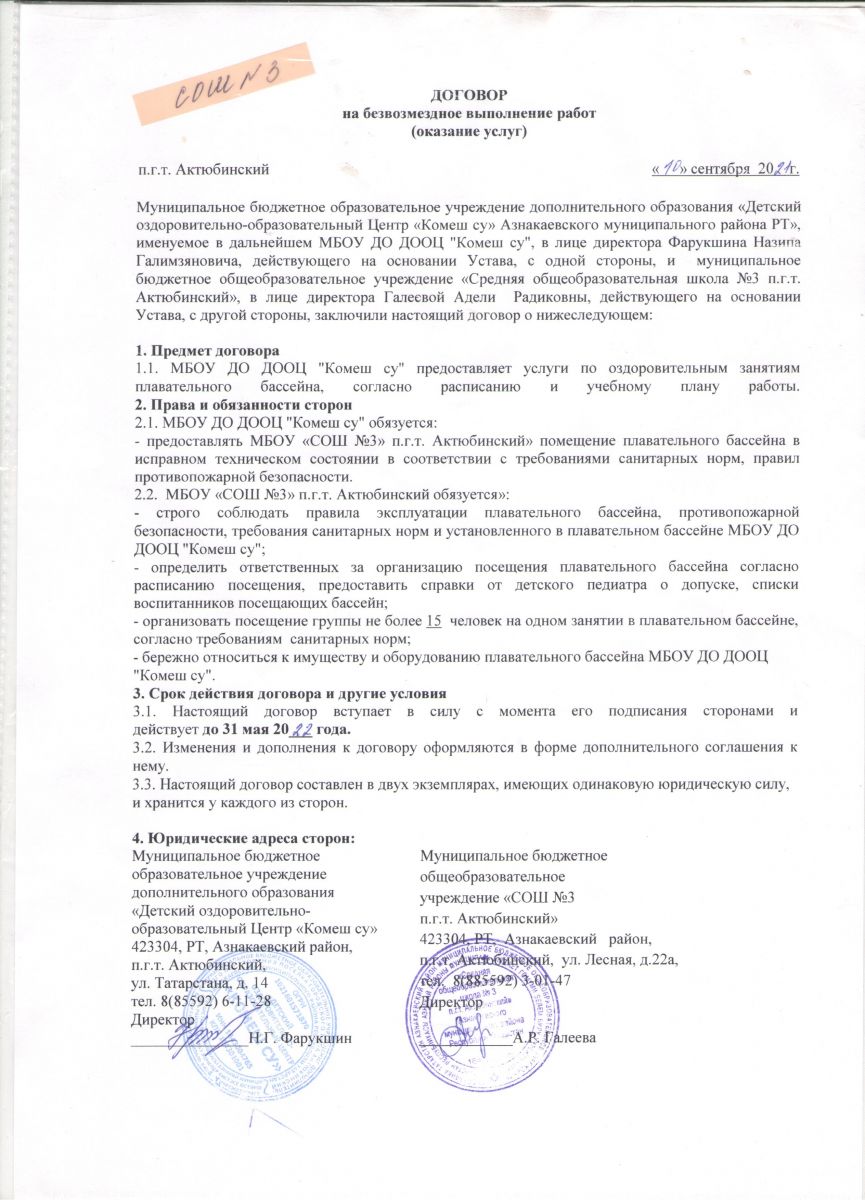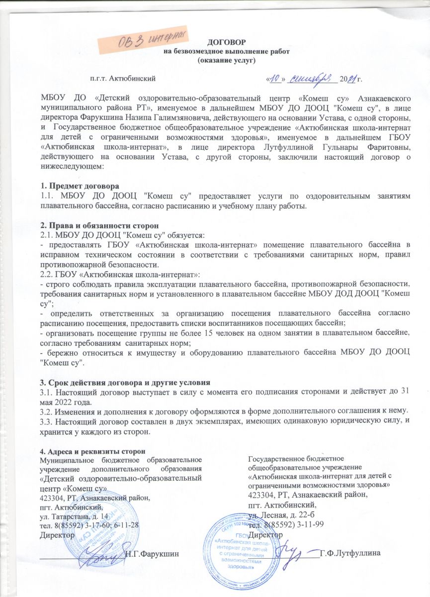 Договор между ДООЦ "Комеш су" и школой-интернат