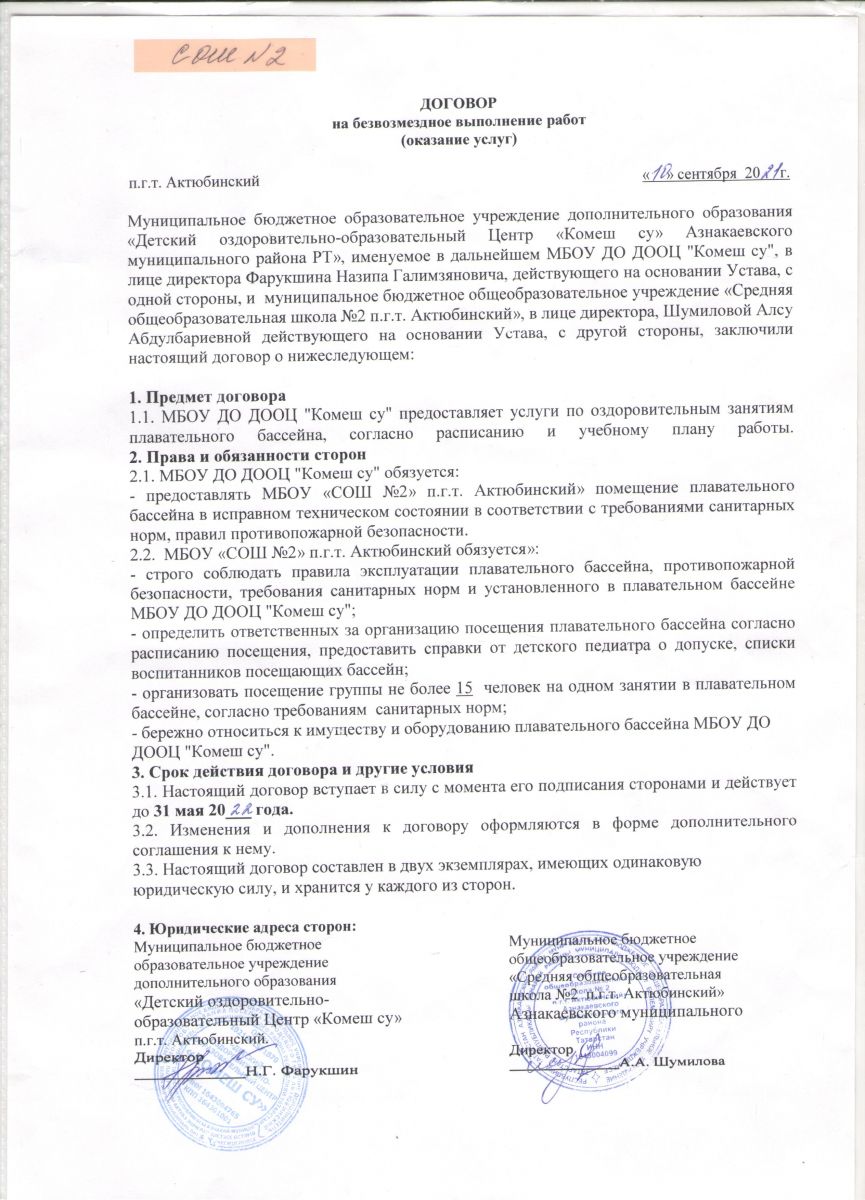 Договор между ДООЦ "Комеш су" и шк.№2