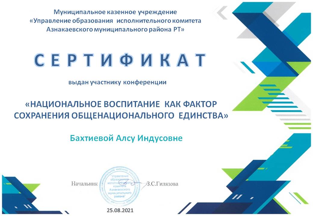 Сертификат участия в конференции "Национальное воспитание как фактор сохранения общенационального единства", Абдурахманова Г.М.