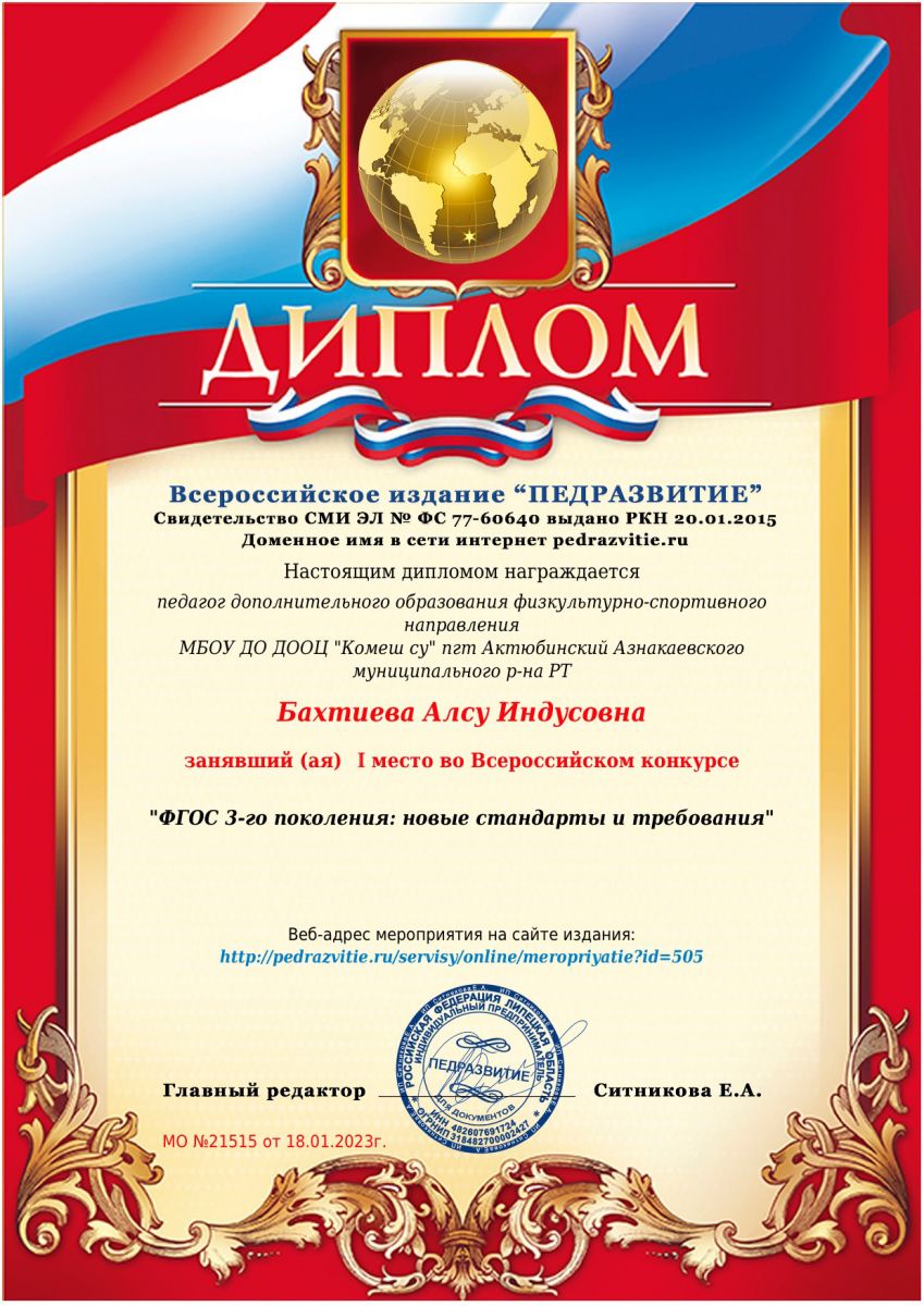 Диплом 3 место в Международном конкурсе "Физическая культура", Гусева А.М., 2022г.