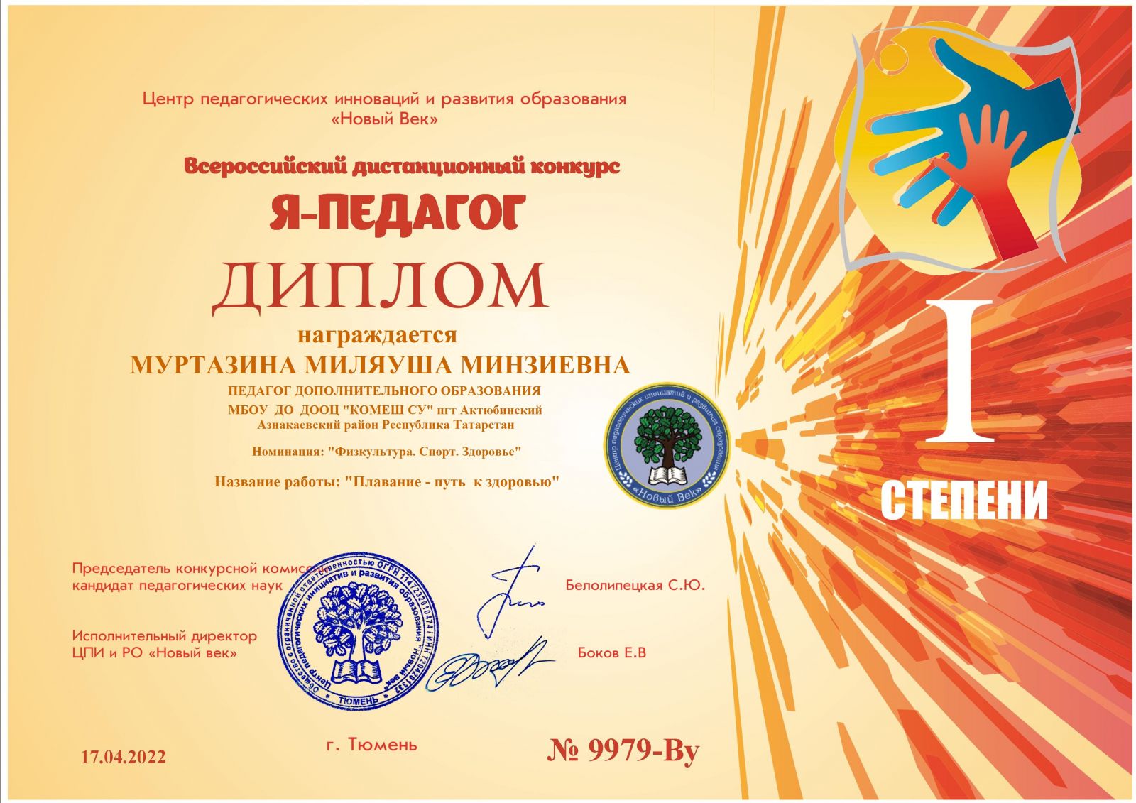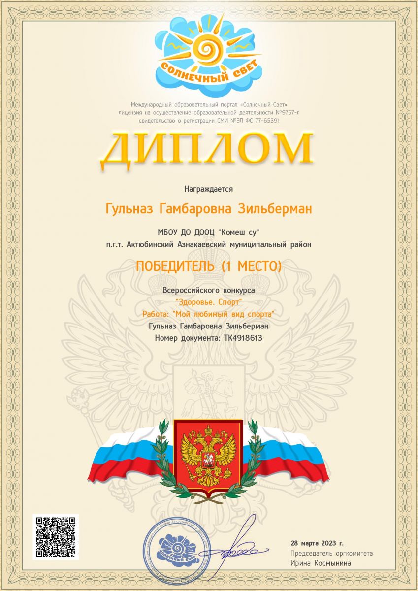 Диплом 1 место Всероссийского конкурса "Здоровье.Спорт", Зильберман Г.Г., 2023г.