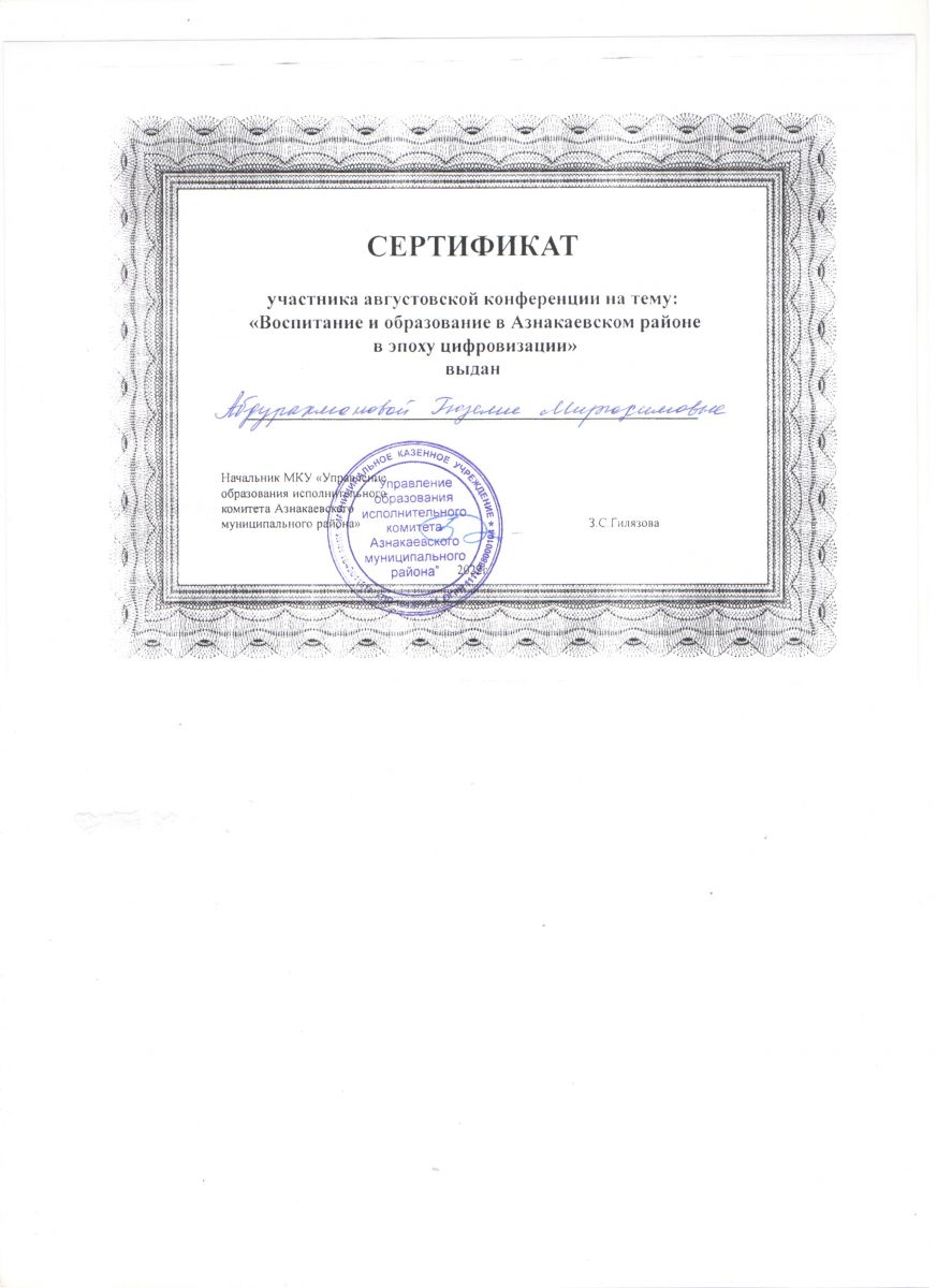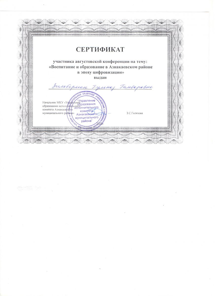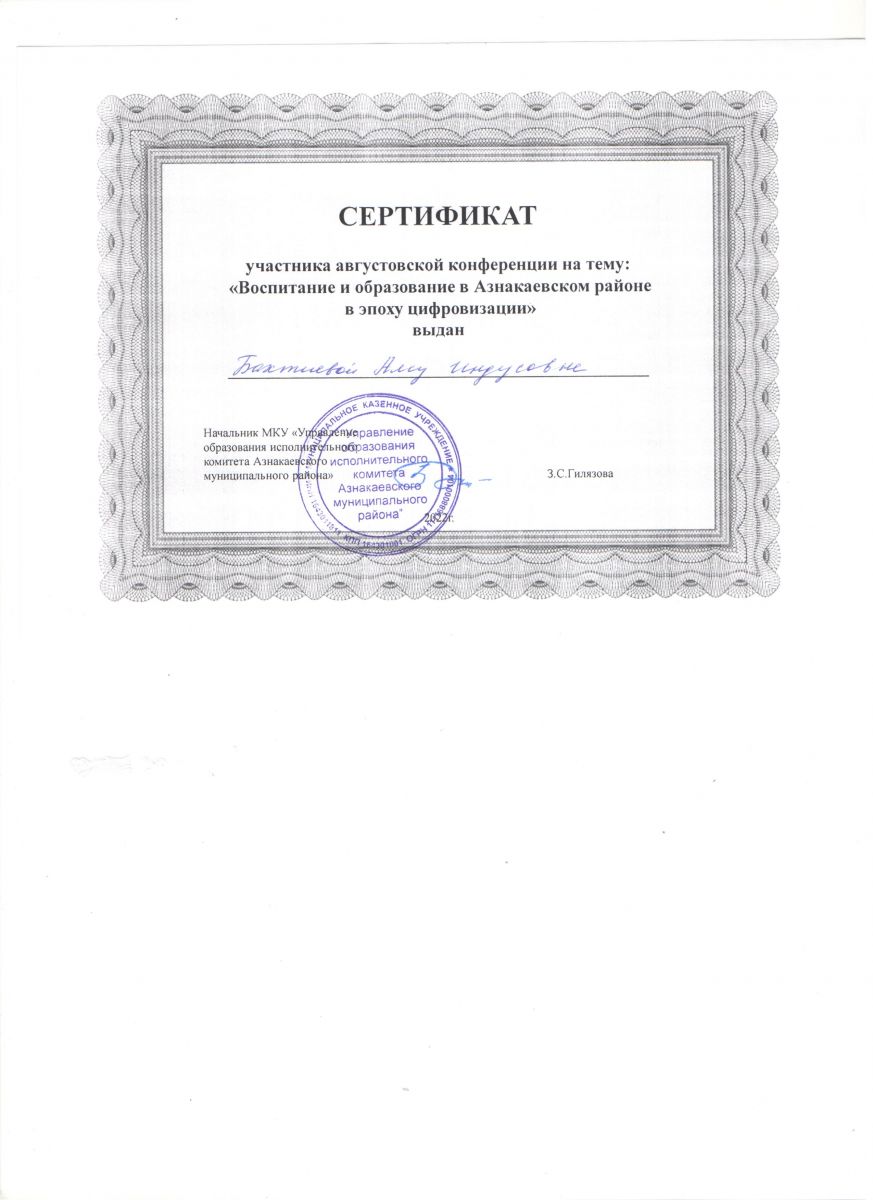 Сертификат участника августовской конференции на тему: "Воспитание и образование в Азнакаевском районе в эпоху цифровизации", Абдурахманова Г.М., 2022г.