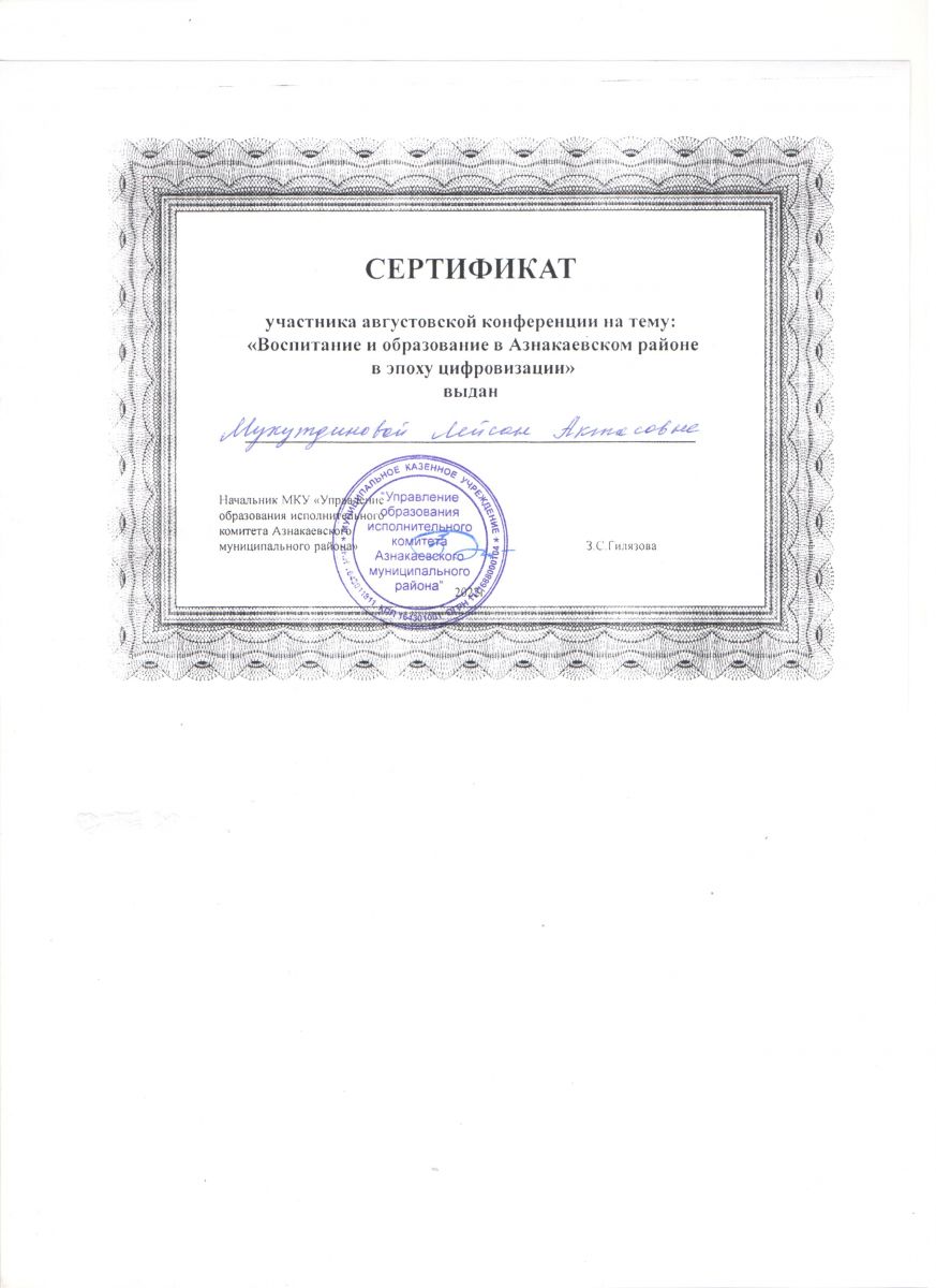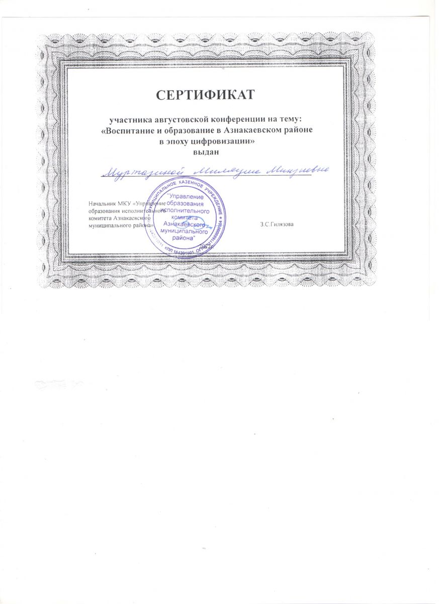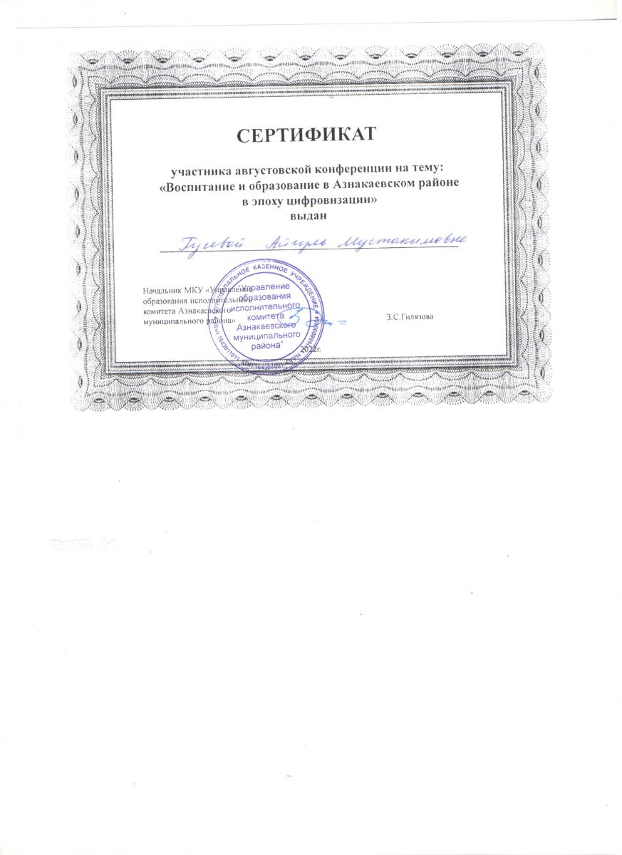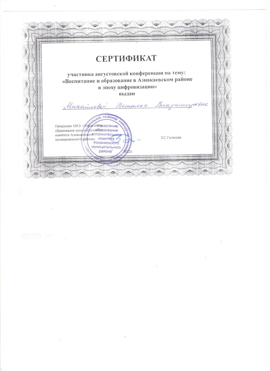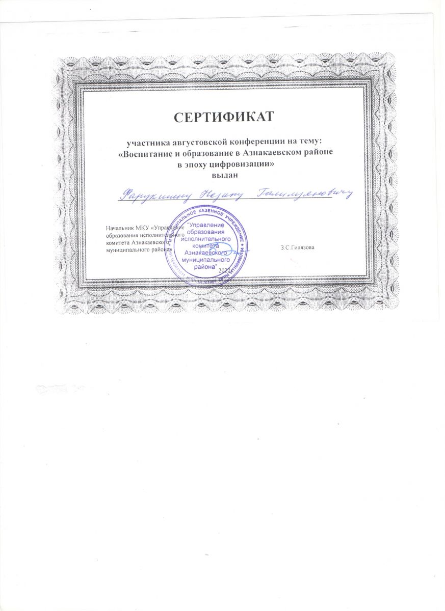Сертификат участника августовской конференции на тему: "Воспитание и образование в Азнакаевском районе в эпоху цифровизации", Фарукшин Н.Г., 2022г.