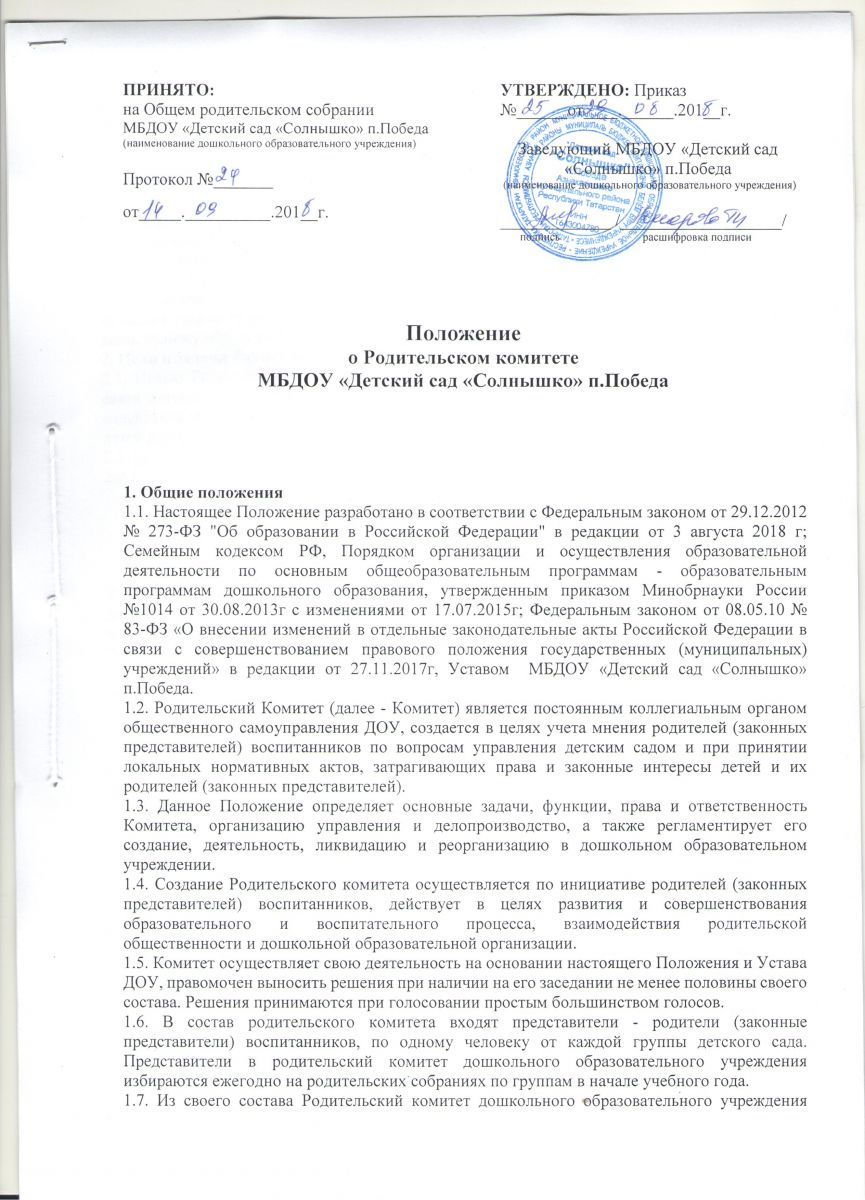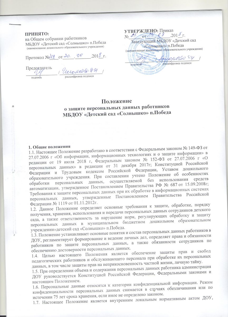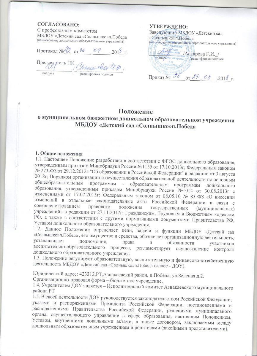 Положение о МБДОУ "Детский сад "Солнышко" п.Победа