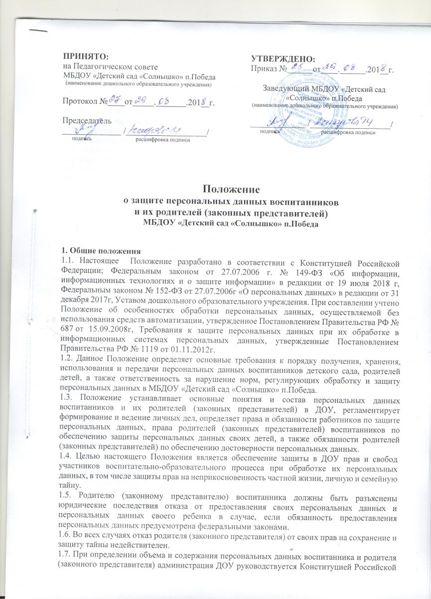 Положение о персональных данных воспитанников и родителей (законных предстовителей)