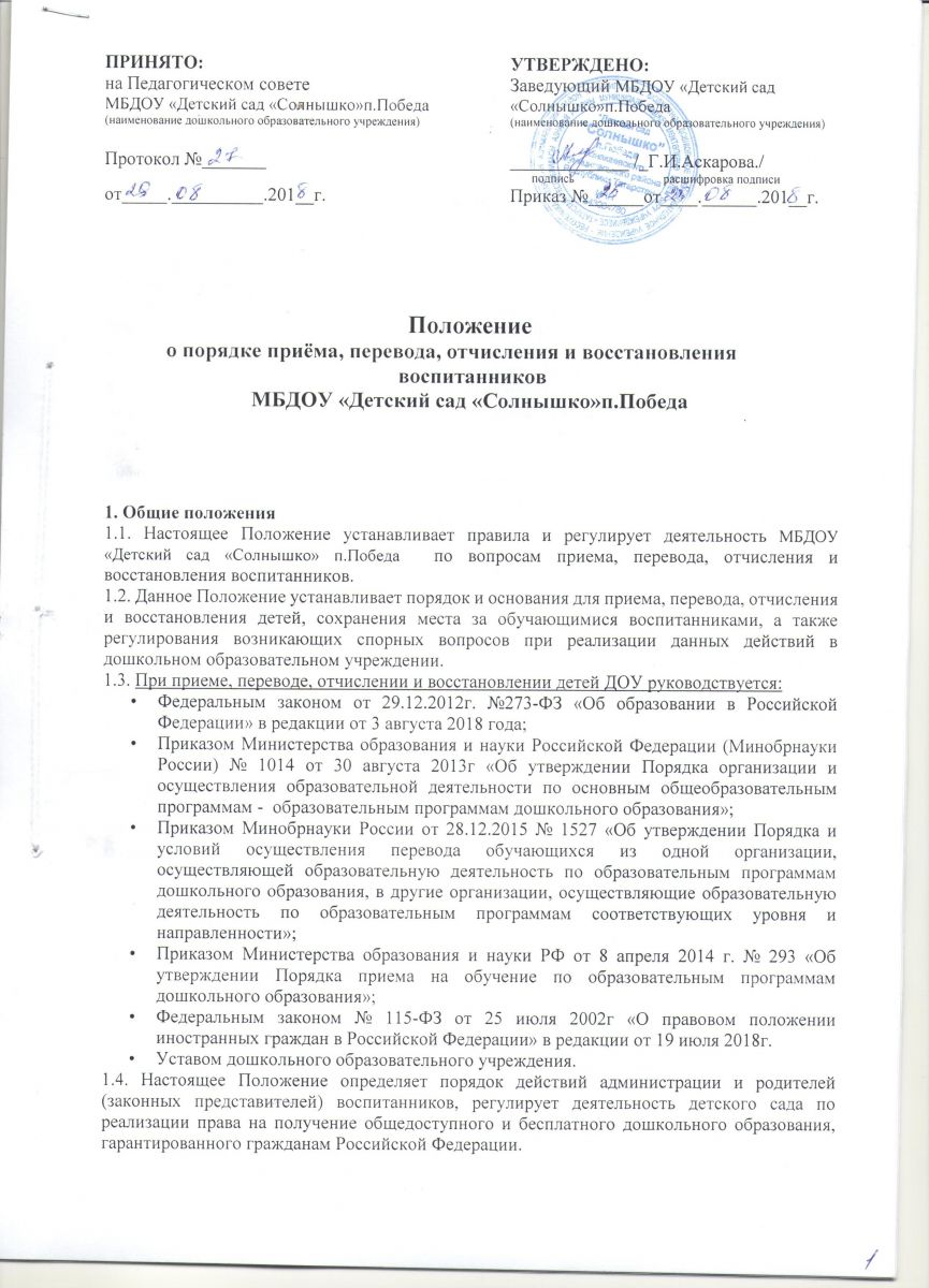 Положение о порядка приема, перевода,отчисления и восстановления воспитанников в новой редакции