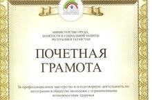 Почетной грамотой Министерства труда, занятости и социальной защиты Республики Татарстан за профессиональное мастерство и плодотворную деятельность по интеграции в общество молодежи с ограниченными возможностями здоровья была награждена Шакирова Руфина Вагизовна (учитель музыки). Поздравляем!!!